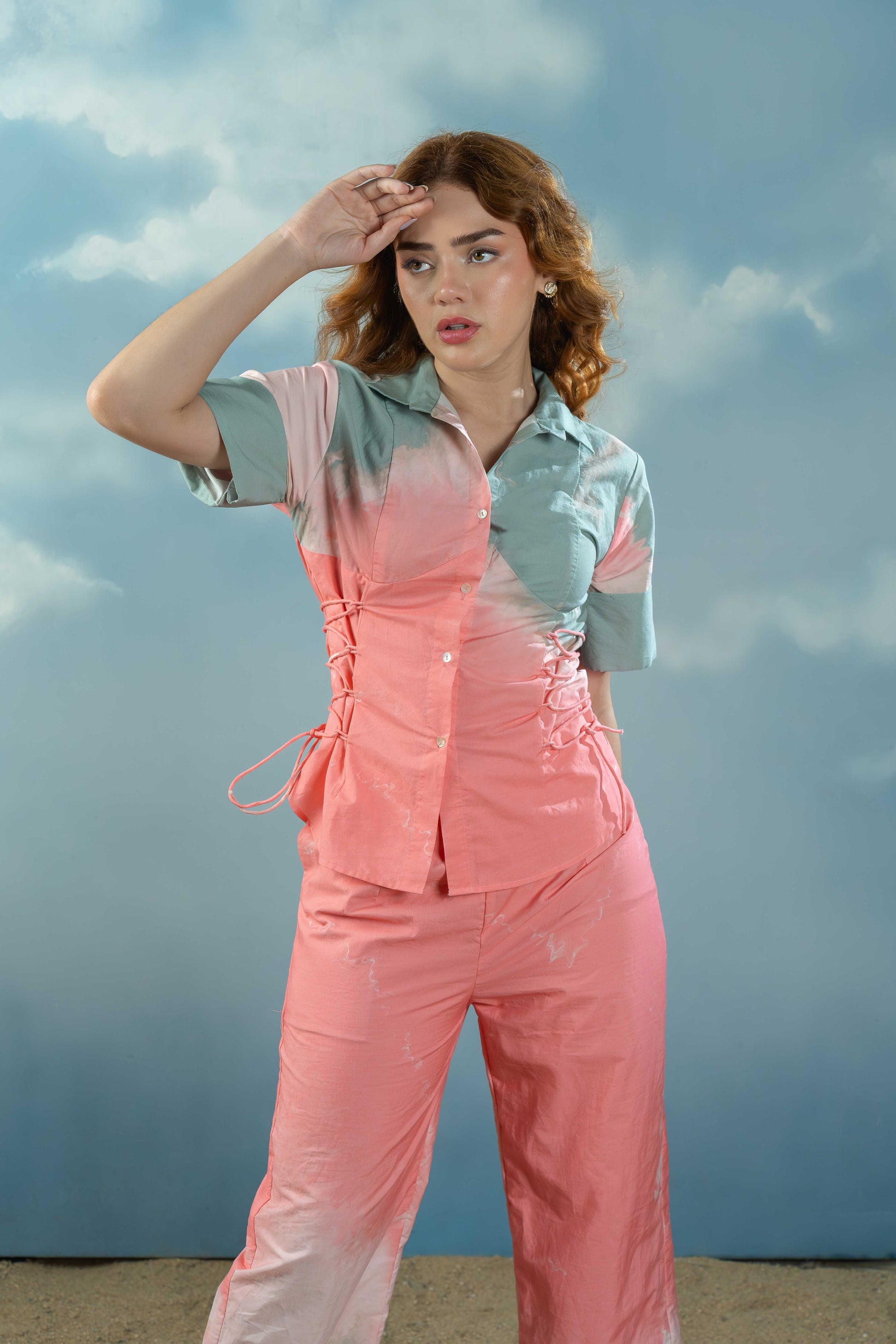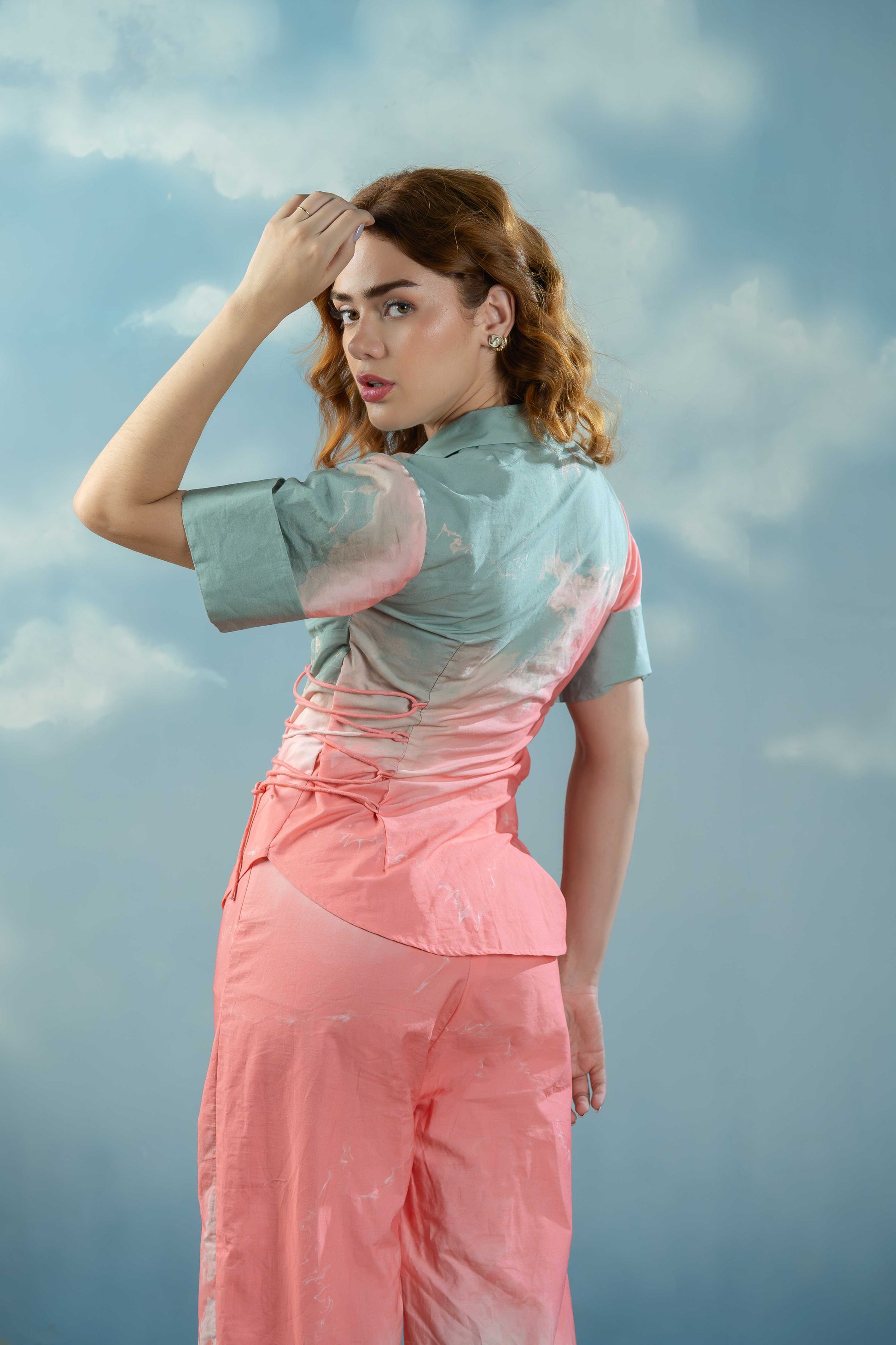 This coord set features soft pastel tones of peach and mint with a dreamy, cloud-like print. Designed with lace-up side details and a relaxed fit, it’s perfect for effortless, everyday chic