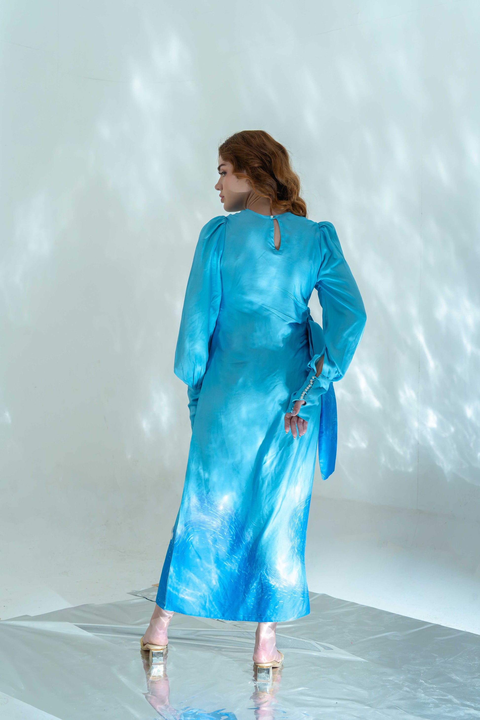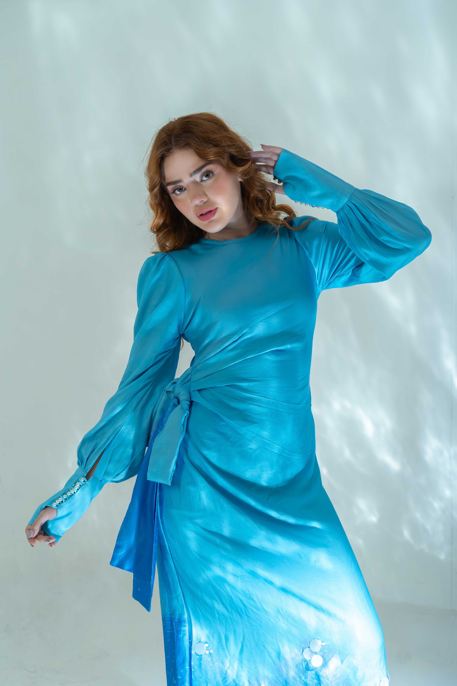 Elegant aqua satin with puff sleeves, side tie, and floral hem details. Effortlessly chic.