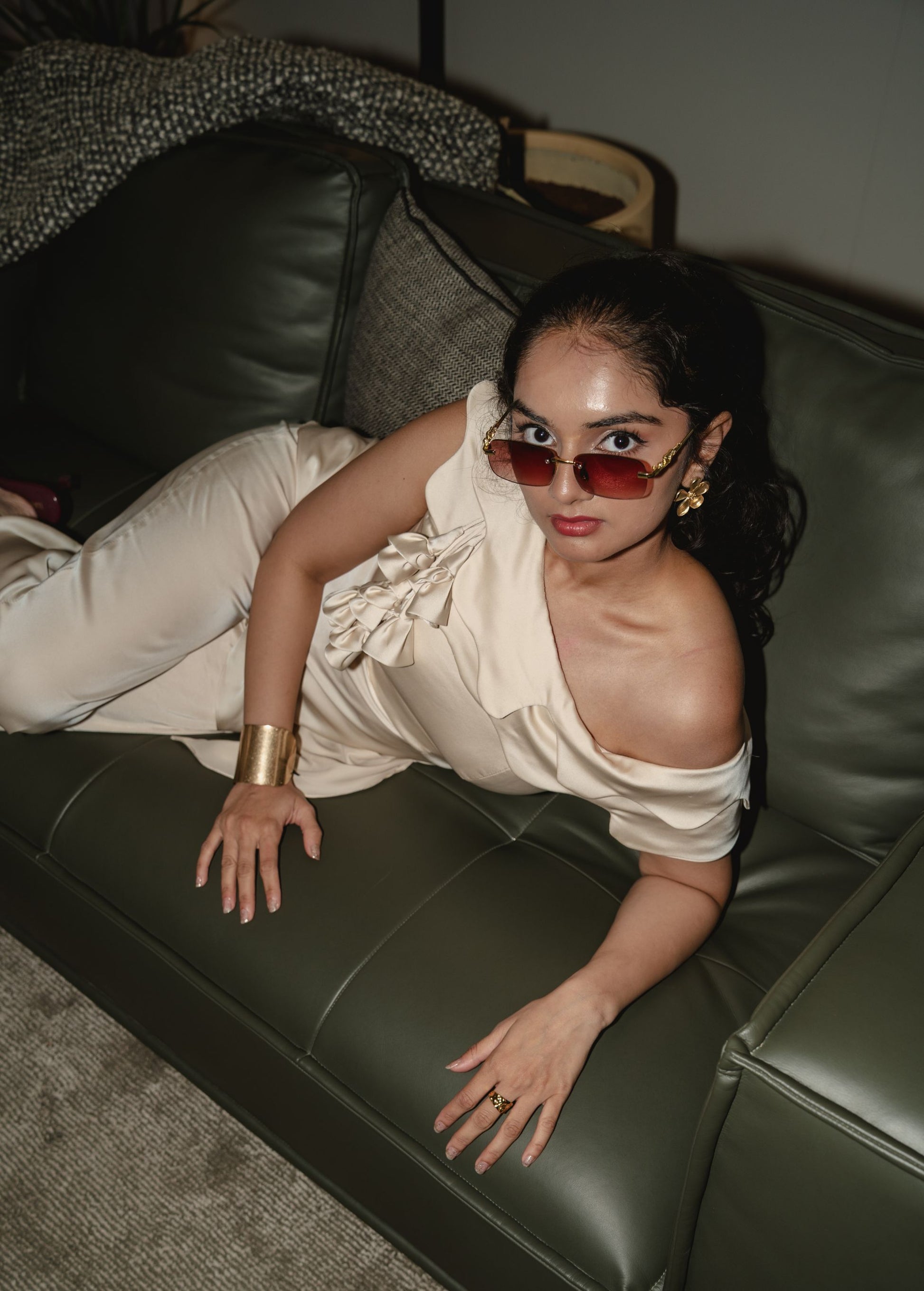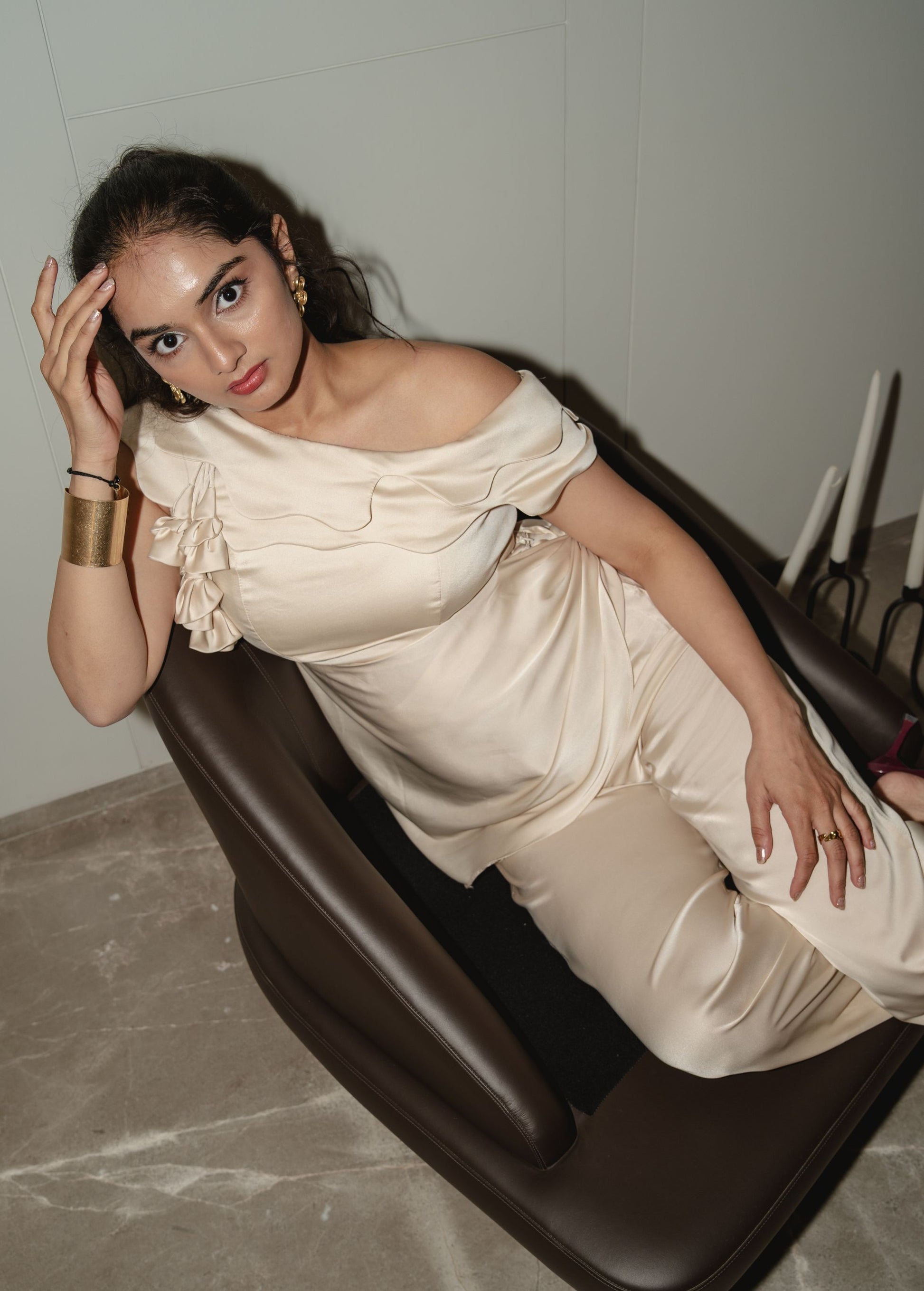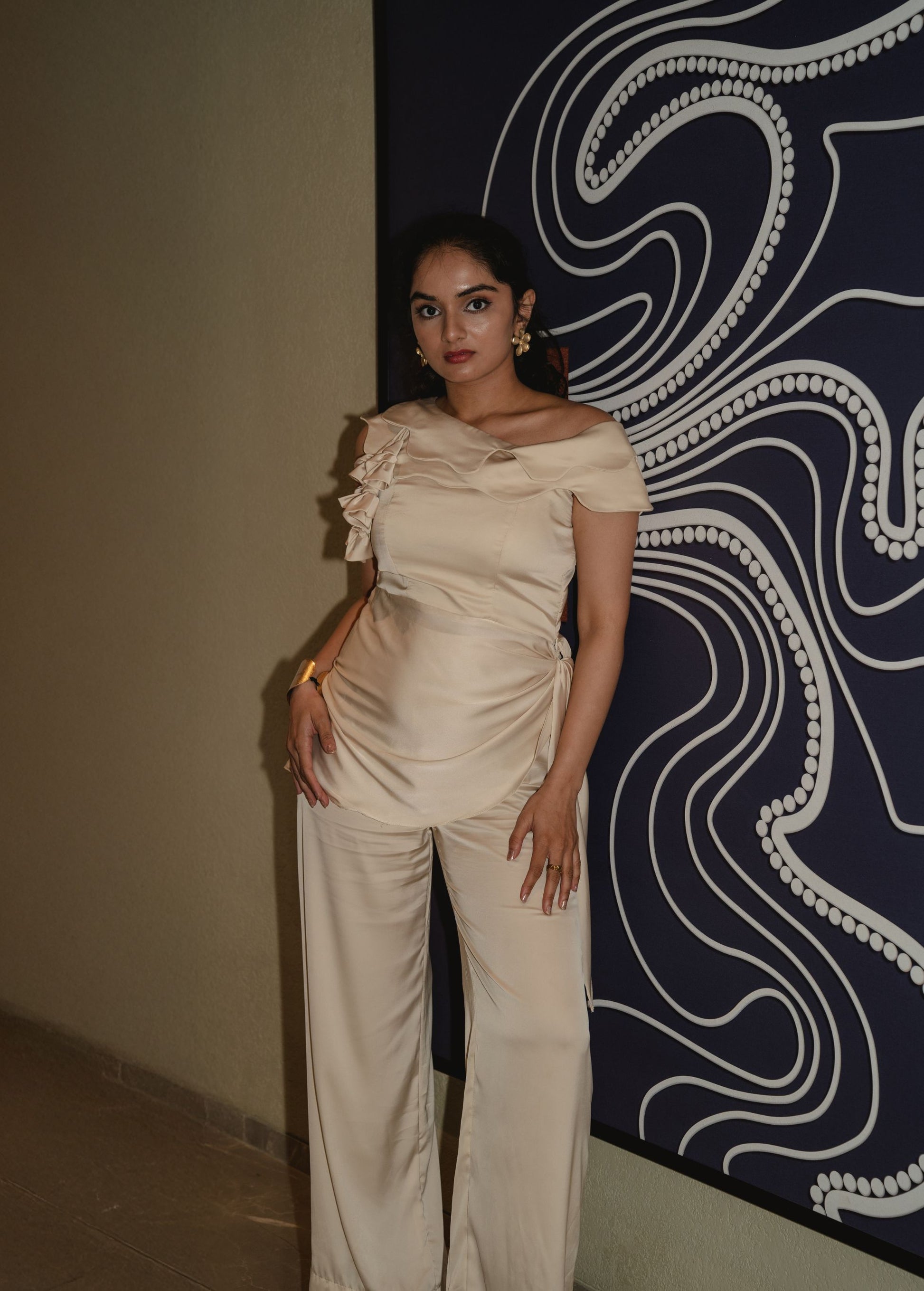 This white co-ord set features a drape-style design with curve detailing along the neckline, creating a fluid, graceful silhouette ideal for evening wear.