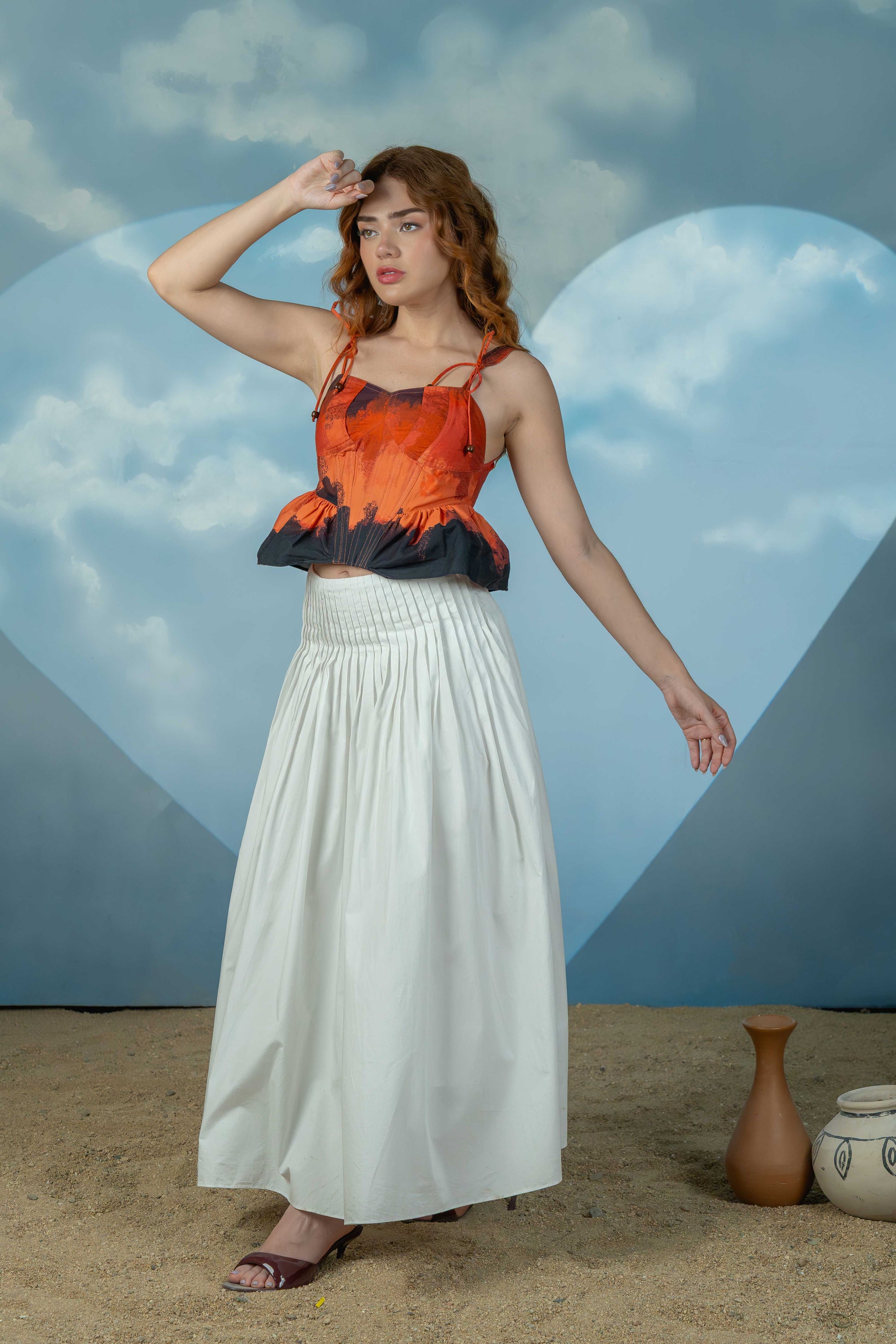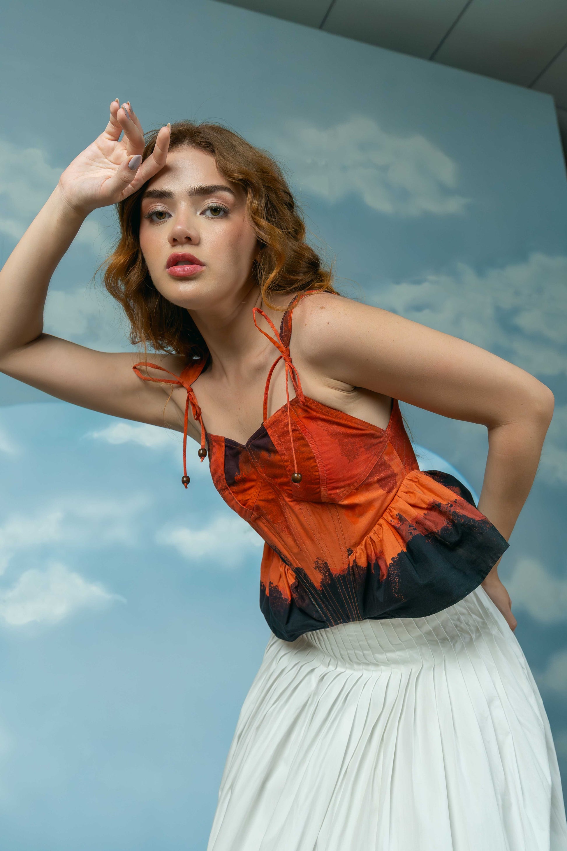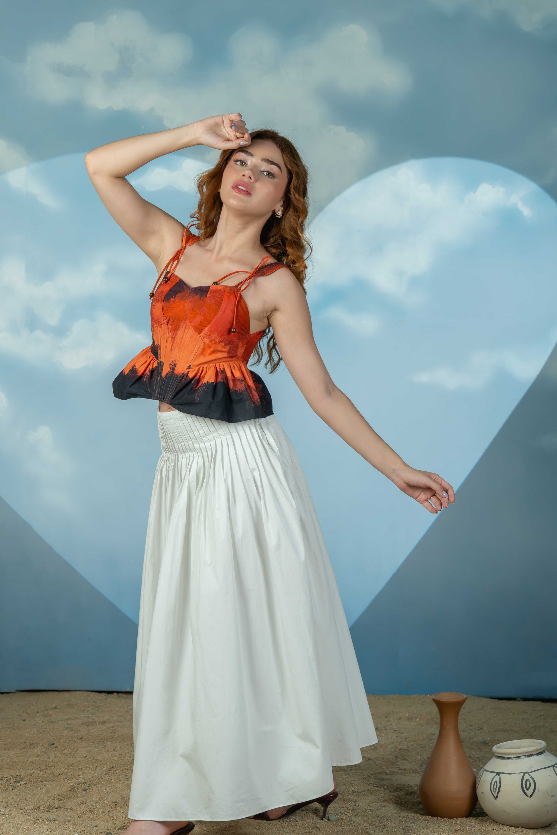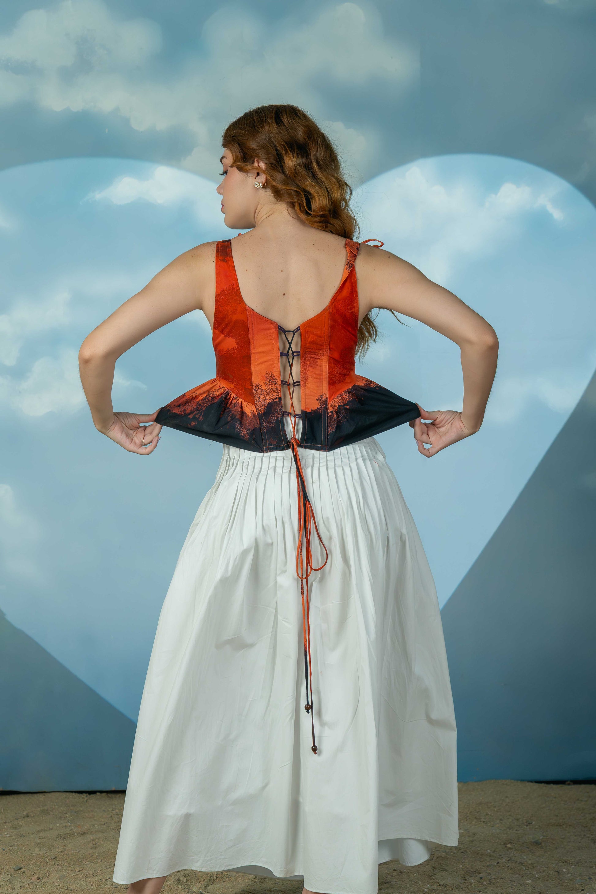 This striking corset features bold shades of red and black, blending drama with elegance. It includes delicate tie details on the straps for an adjustable fit and playful frills at the bottom that add a soft, feminine touch to the structured silhouette.
