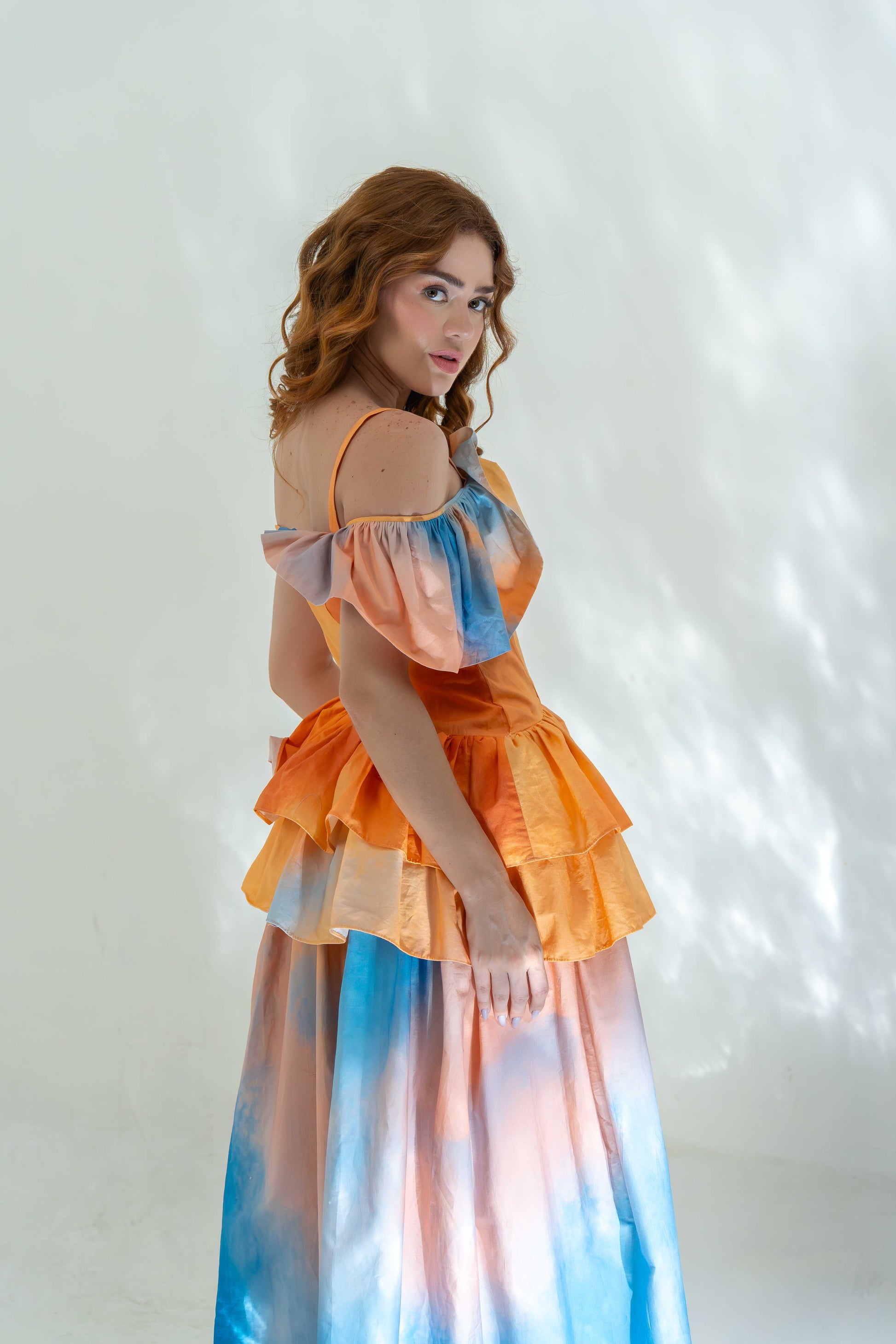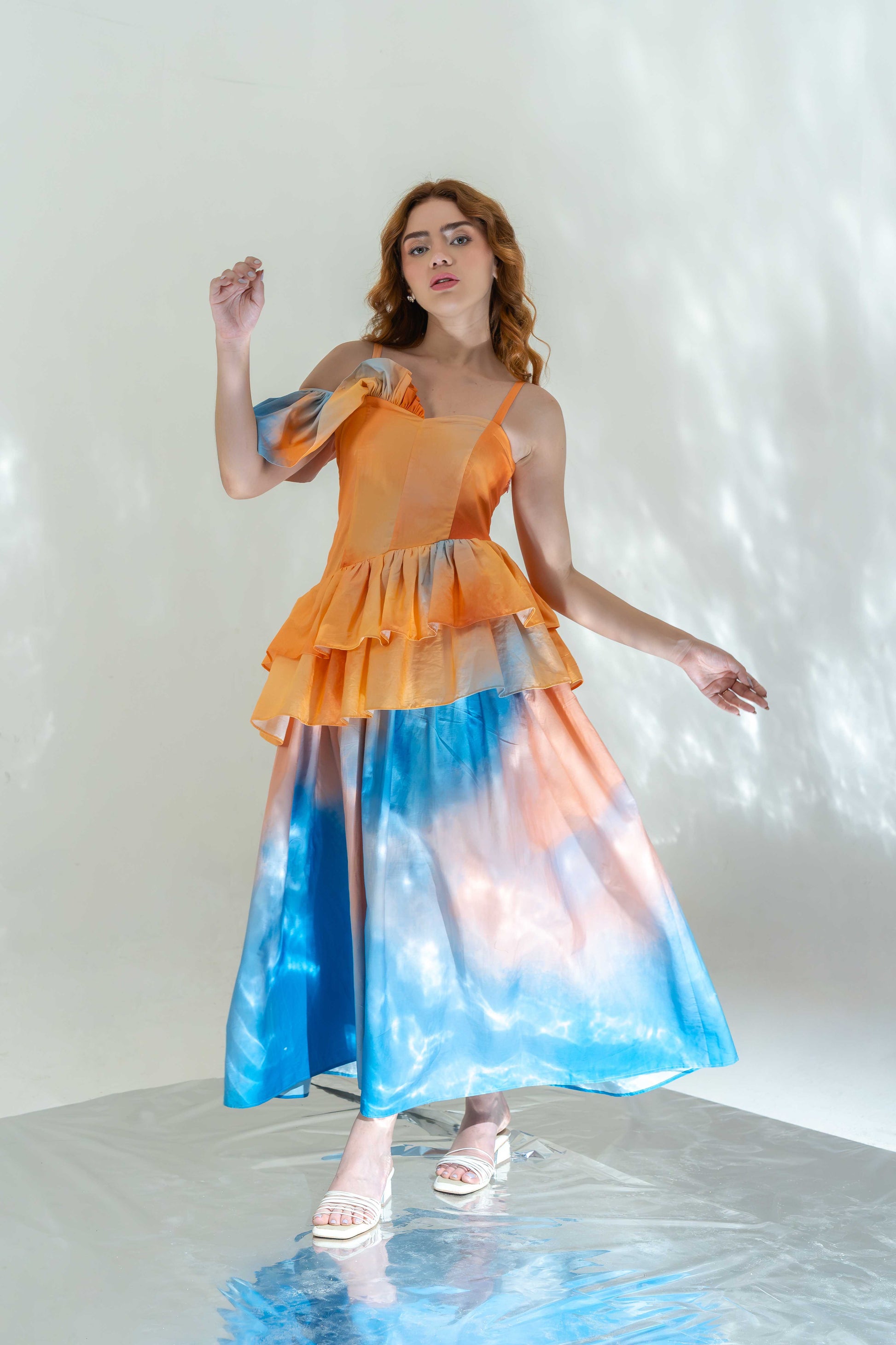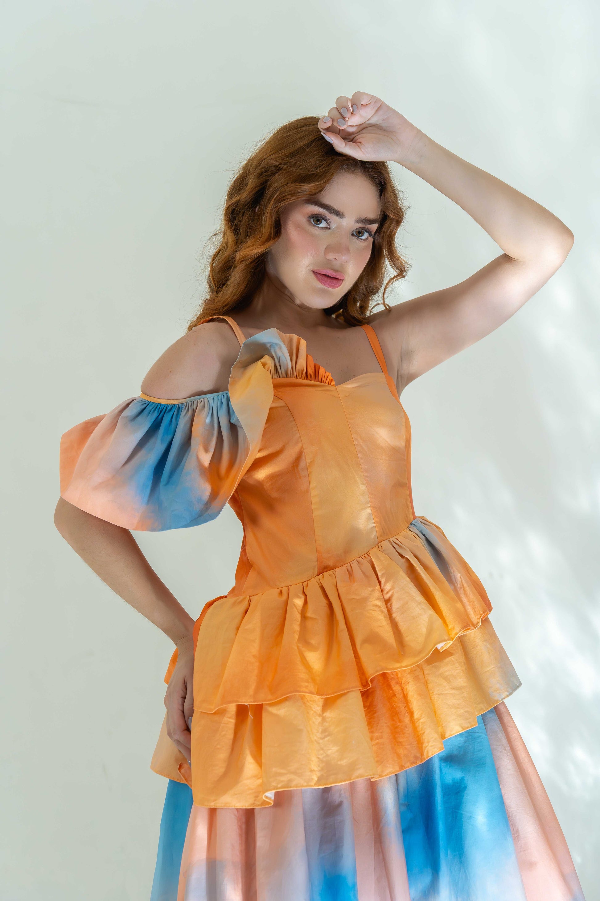 This vibrant dress features a structured orange bodice with layered ruffle detailing and an off-shoulder sleeve. The flowing skirt transitions beautifully from warm orange to soft blue, evoking the dreamy colors of a sunrise sky.