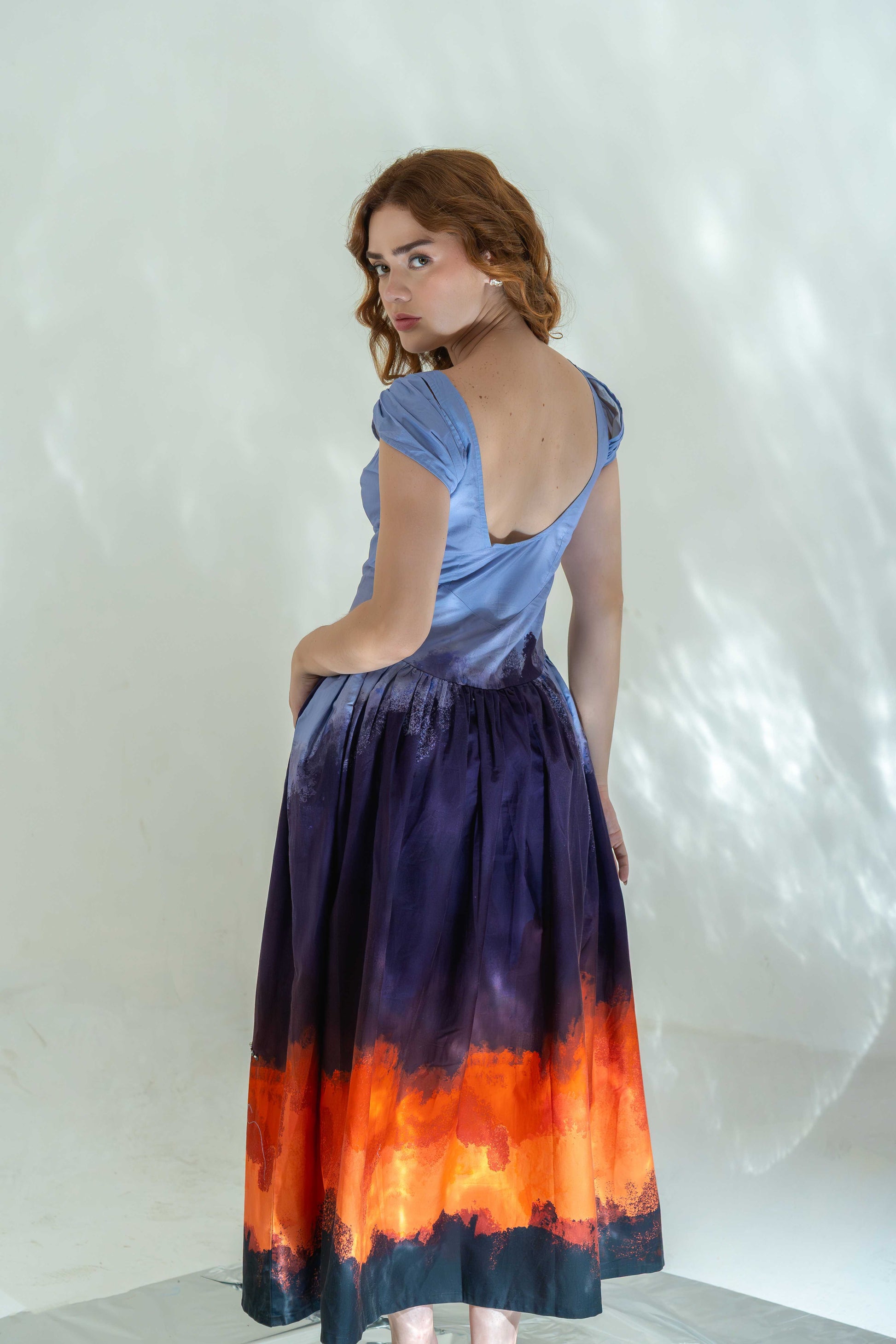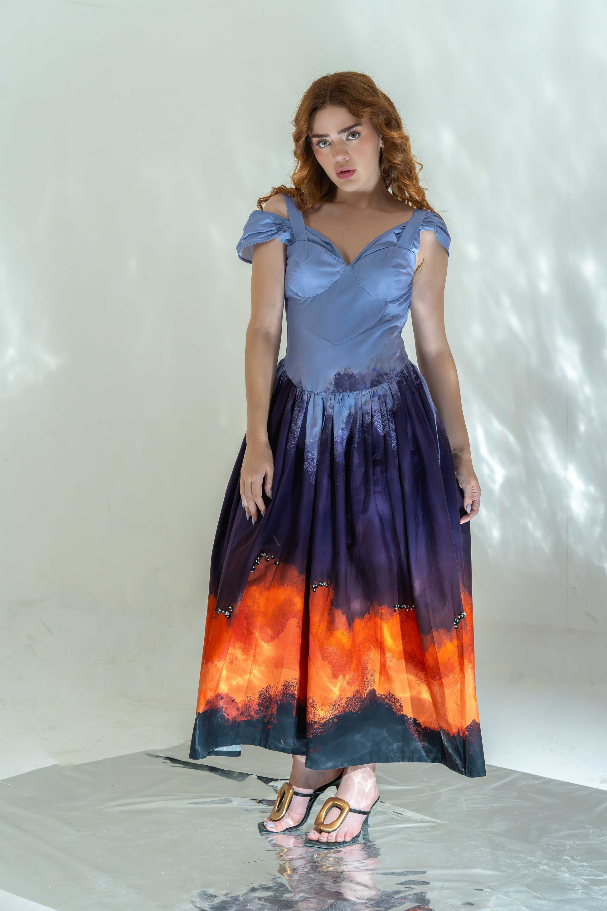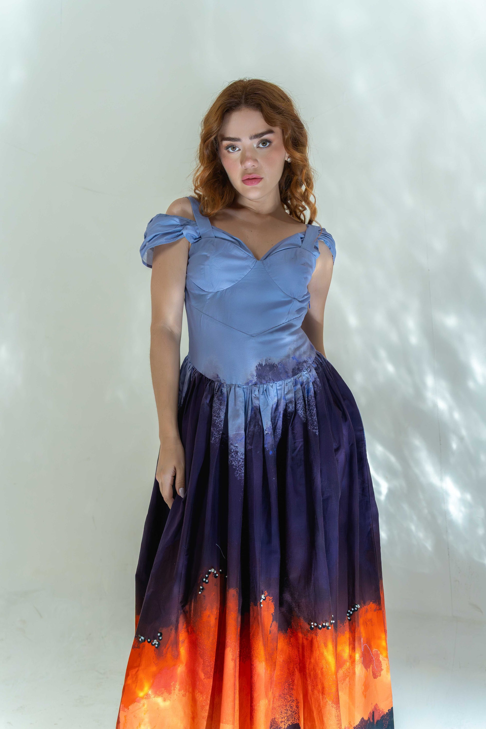 This dress features a structured lavender corset-style bodice paired with a gradient skirt in deep purple, orange, and black tones. Inspired by the colors of a sunset, it’s finished with subtle bead detailing for an elegant, dramatic look