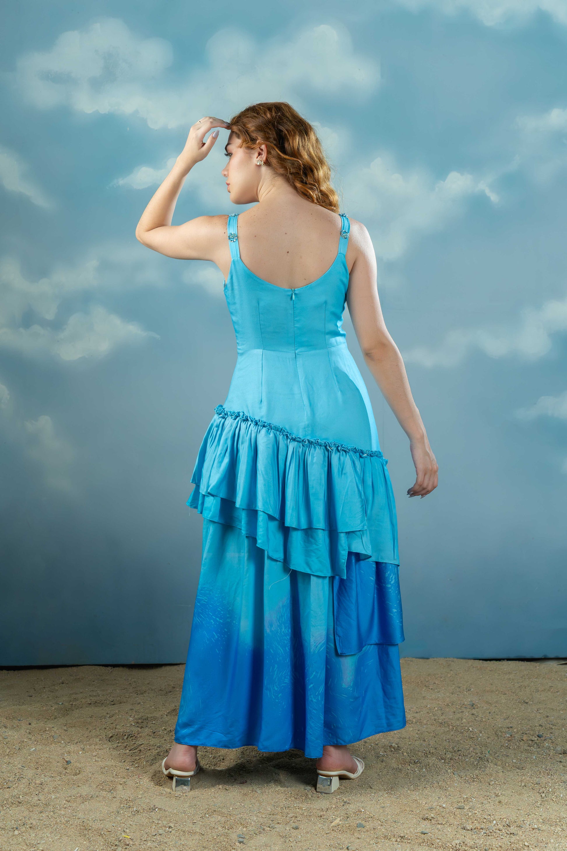This ocean-blue dress features a structured, pleated bustier bodice with thick straps and a flattering fit. The asymmetrical ruffled hem and thigh-high slit add a touch of drama and fluid movement to the look.