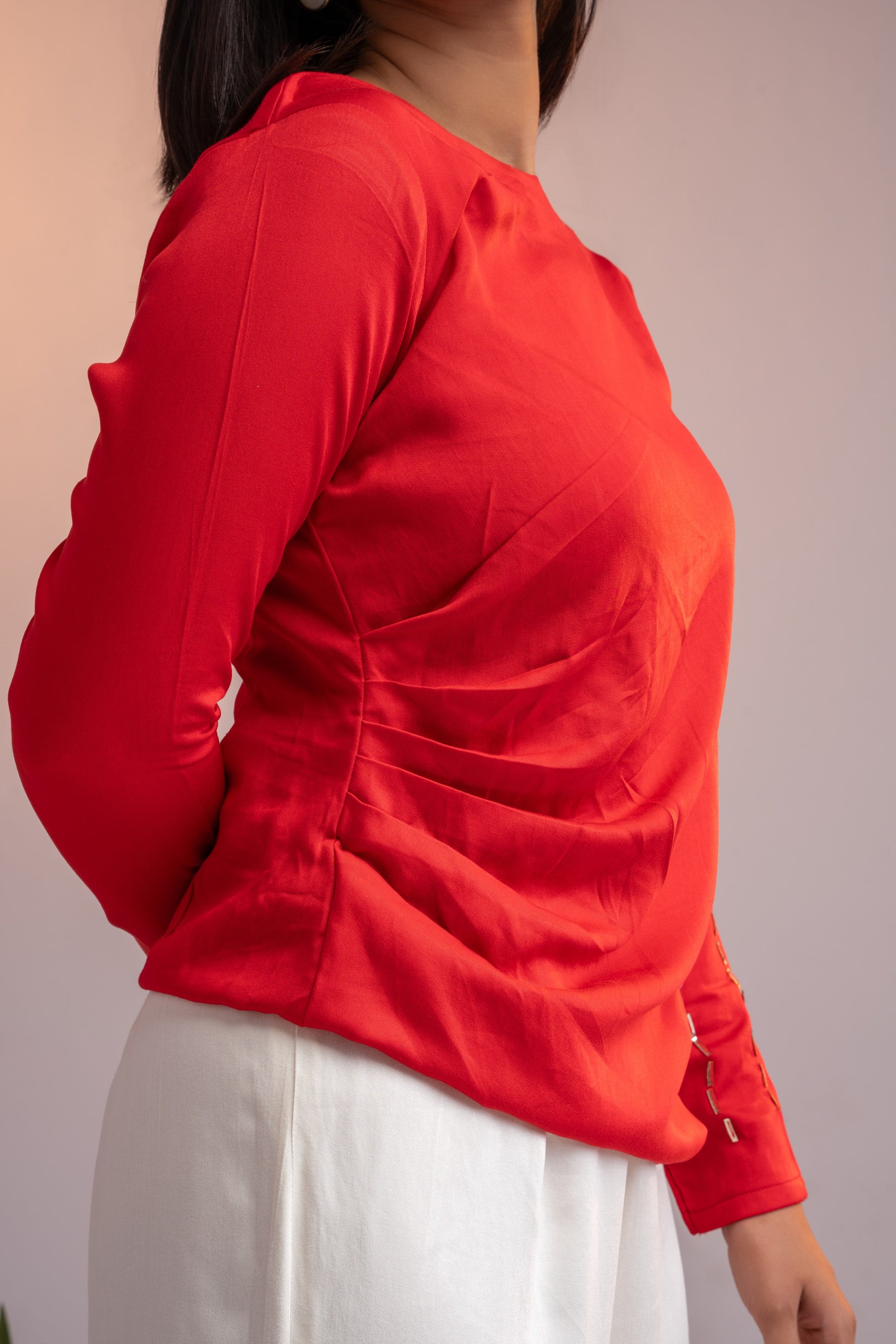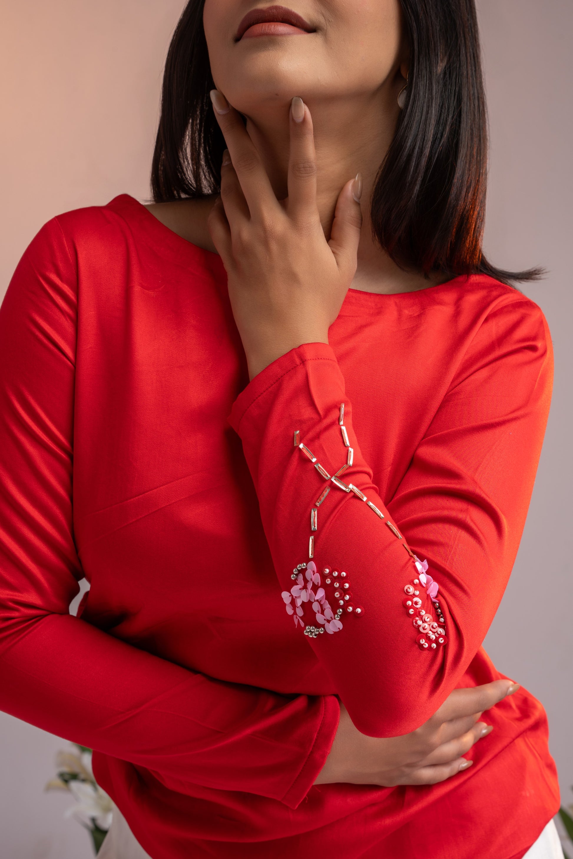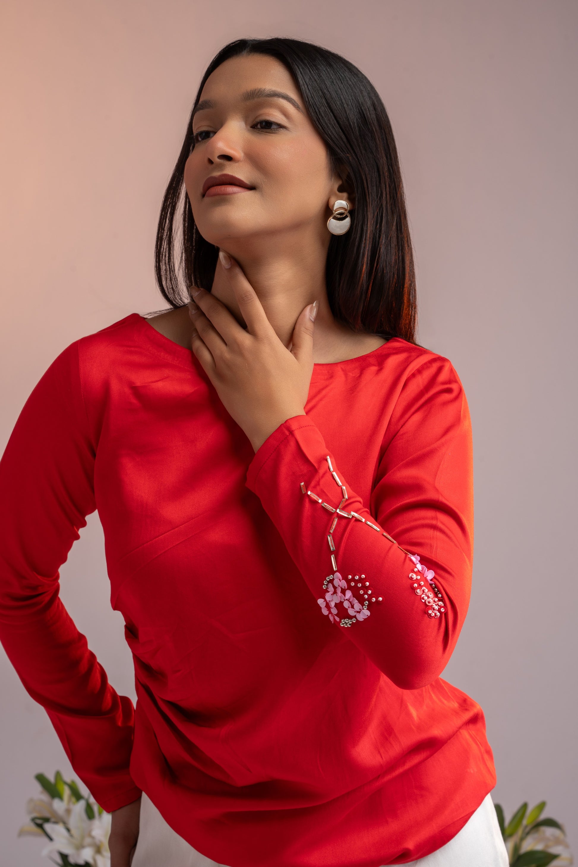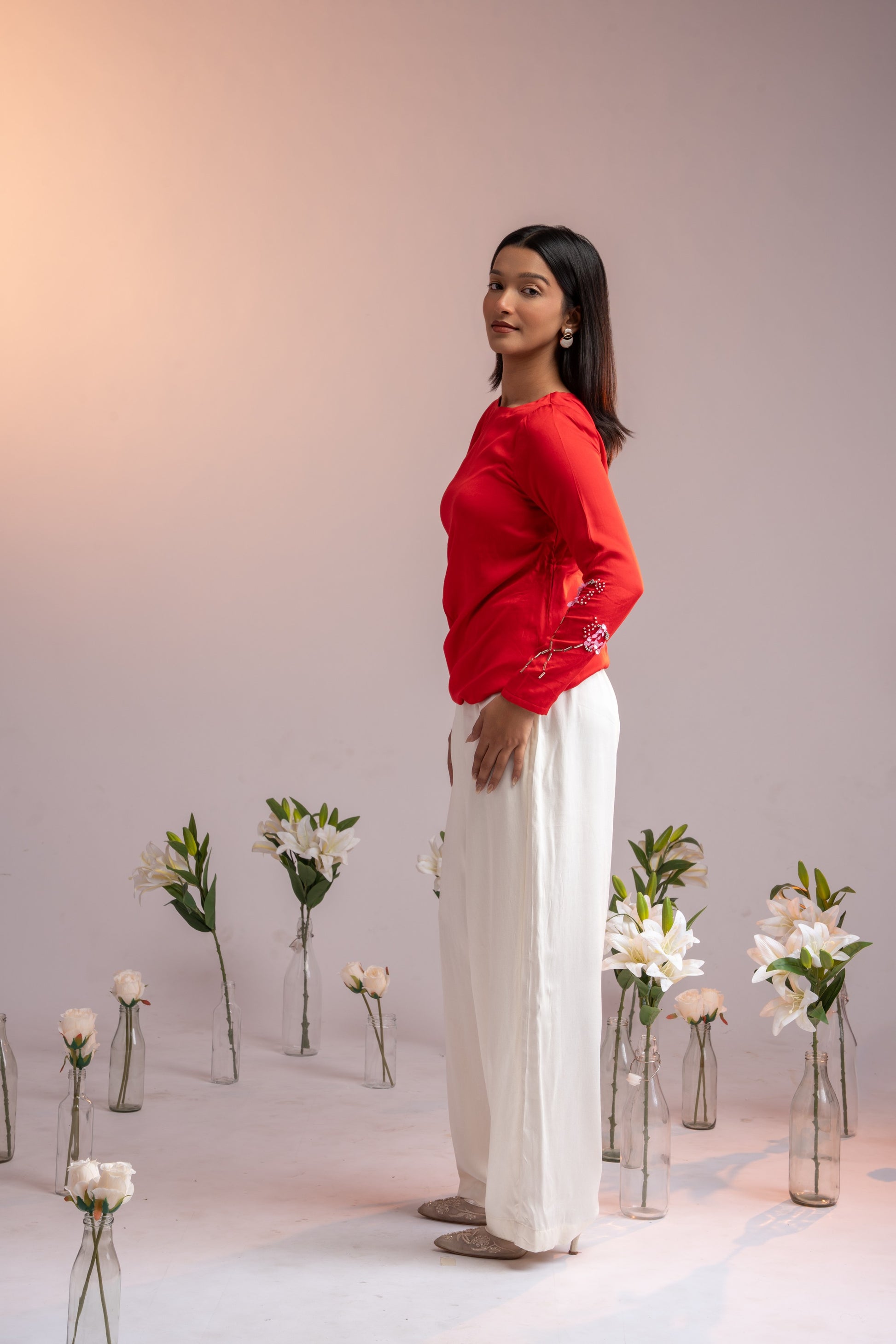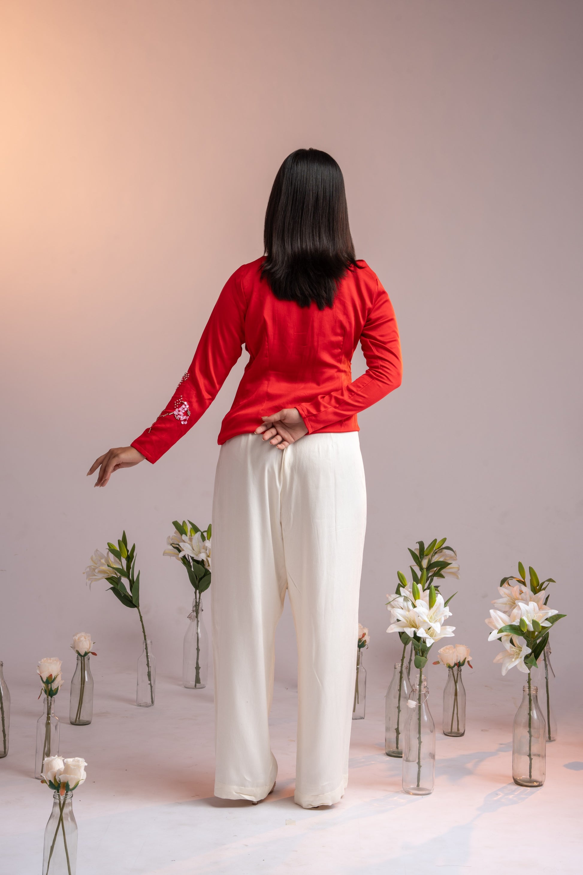 A coral-red top with delicate floral sleeve embroidery, paired with fluid ivory trousers for a clean, graceful silhouette. Minimal, feminine, and effortlessly polished - perfect for elevated everyday wear.
