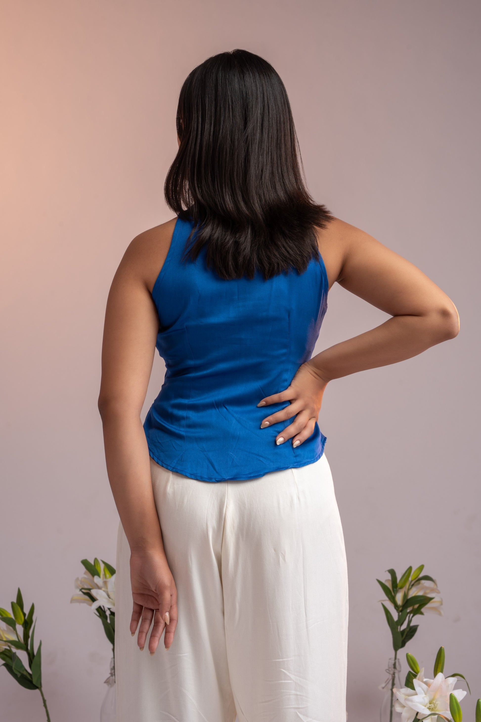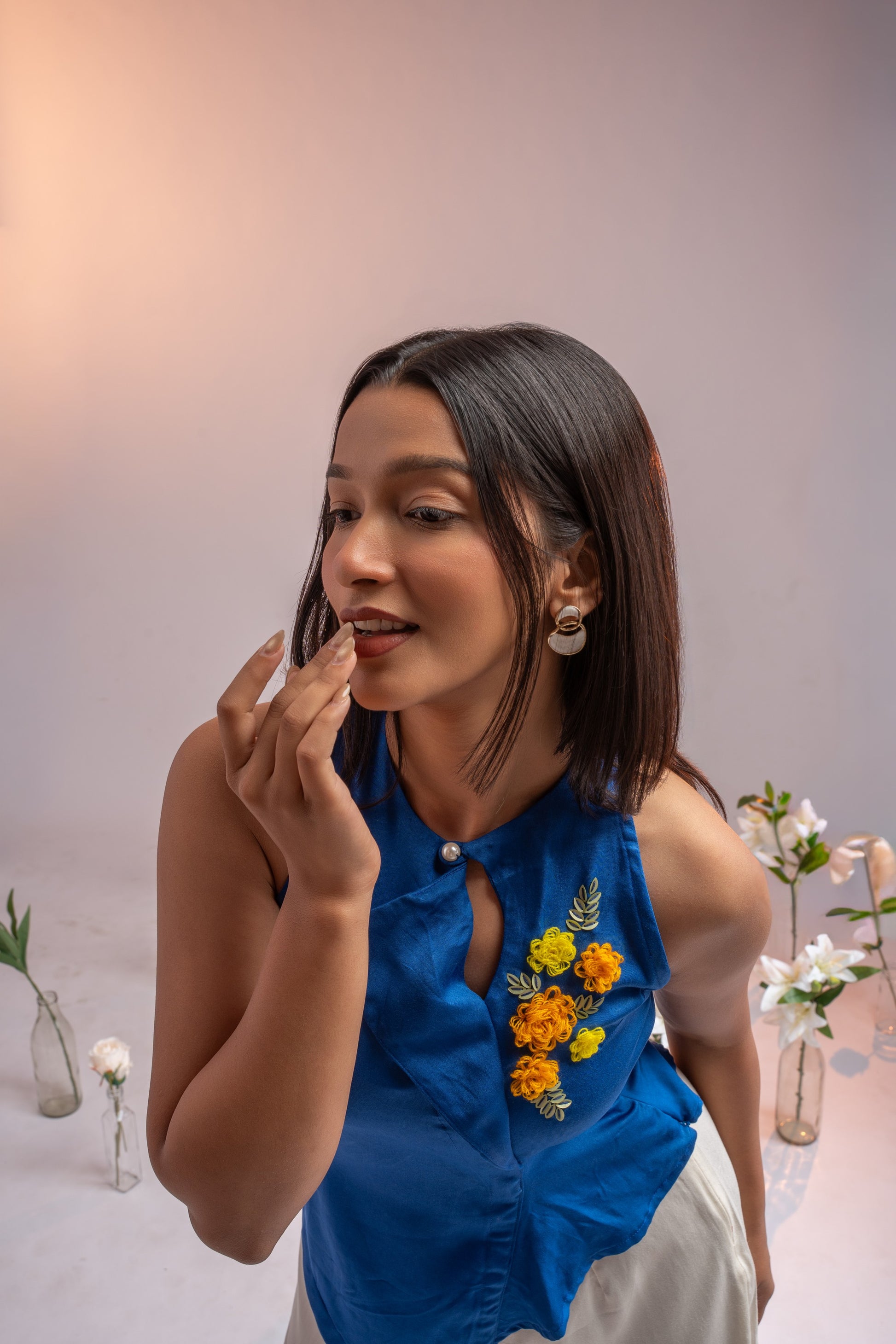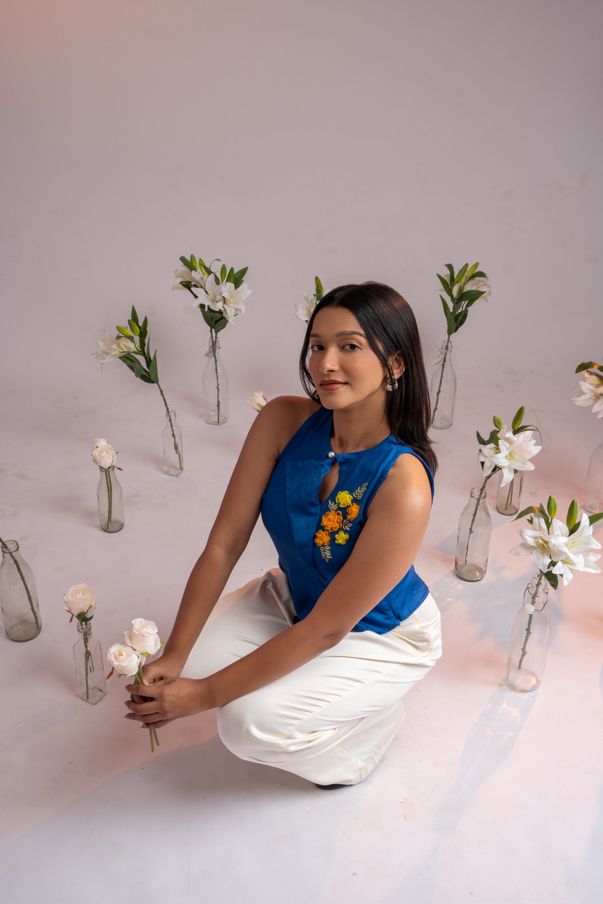 A stylish blue asymmetric top with bright floral embroidery, paired with elegant white wide-leg pants - a fresh, modern look perfect for any occasion.