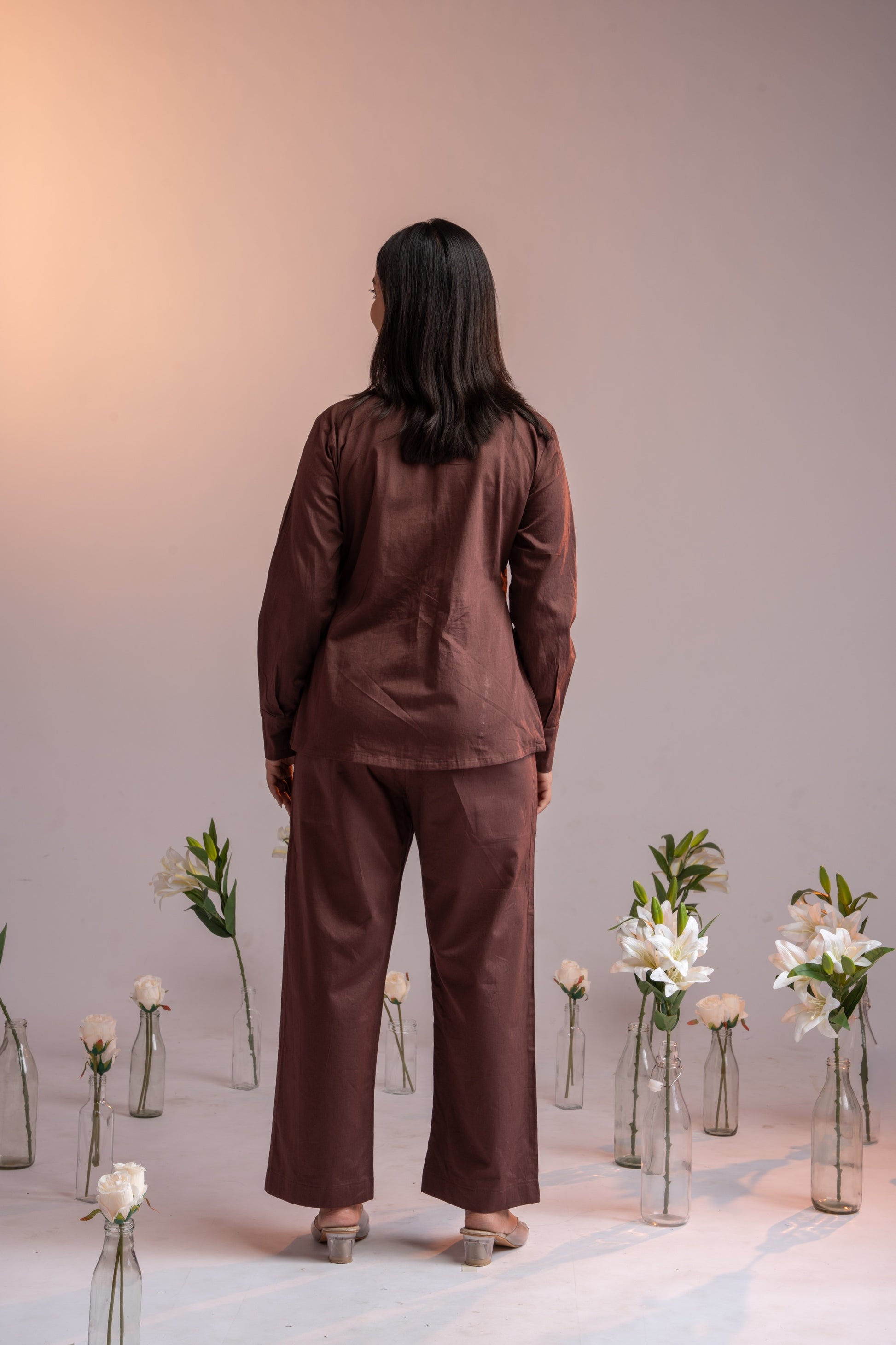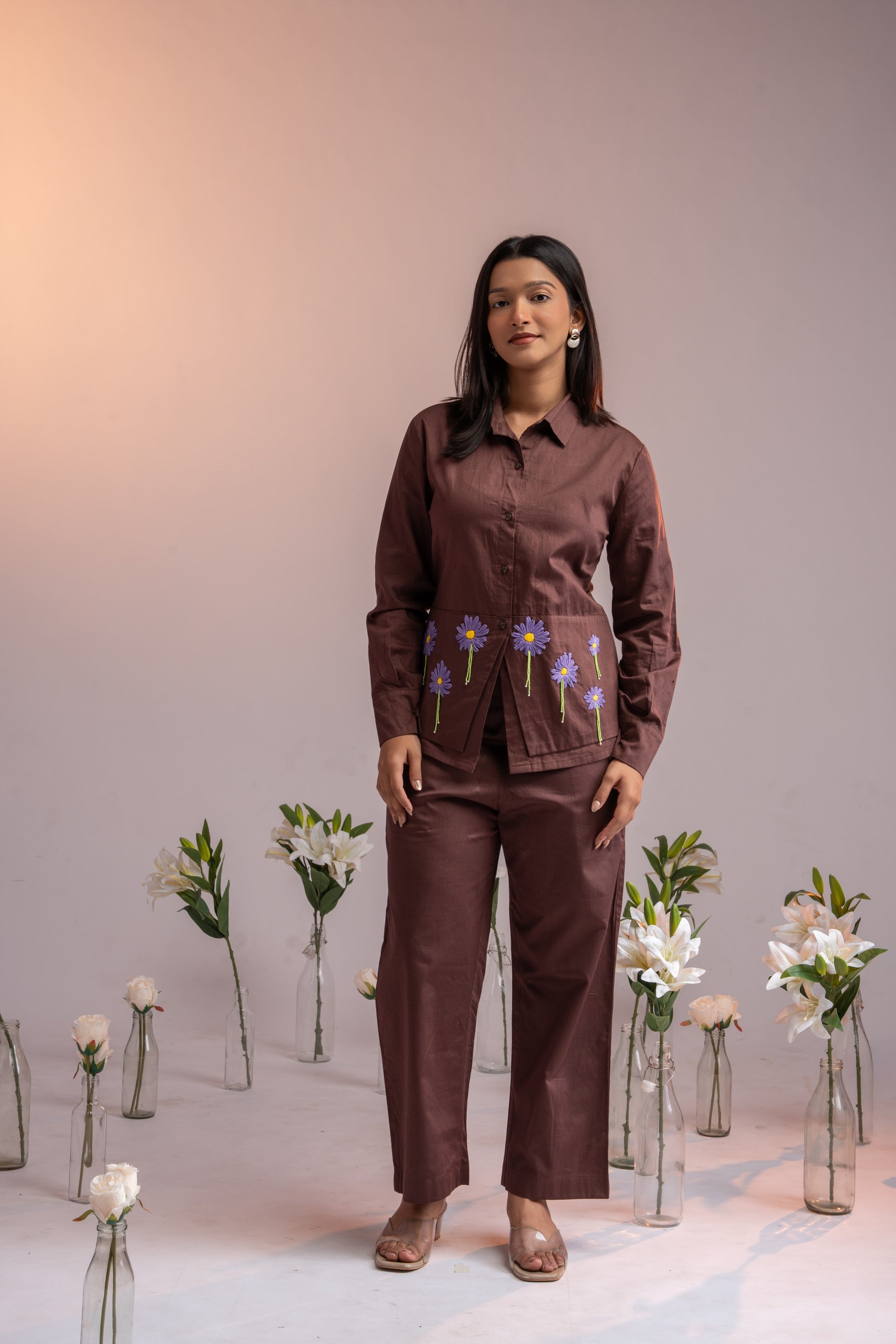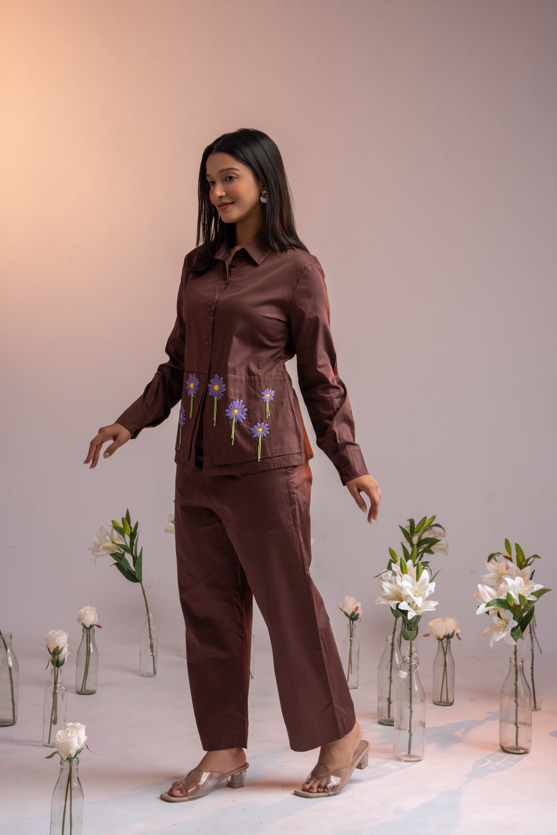 A chic brown co-ord set featuring a button-down top with delicate purple floral embroidery and matching straight-fit pants - a blend of comfort, elegance, and subtle charm.