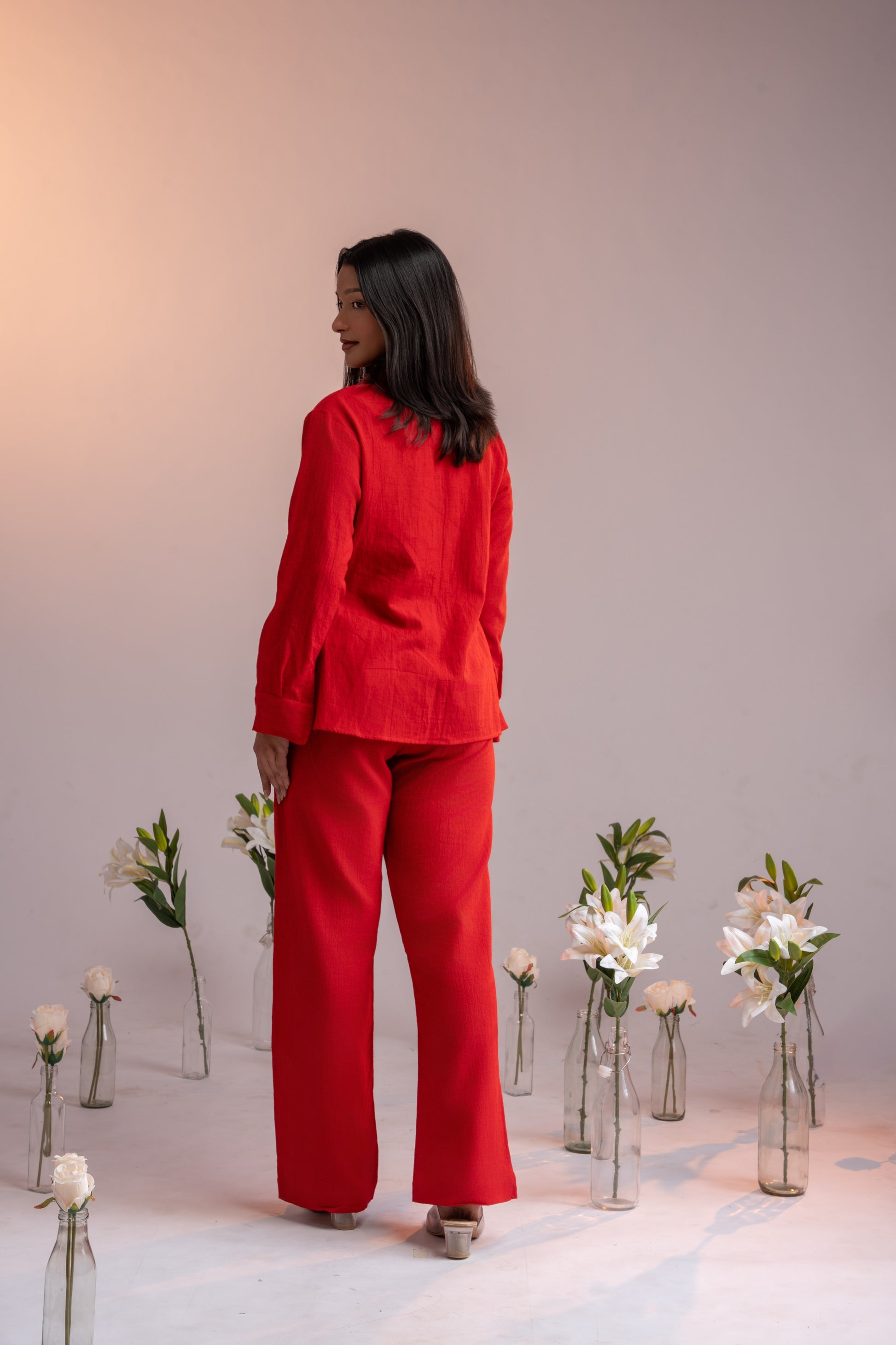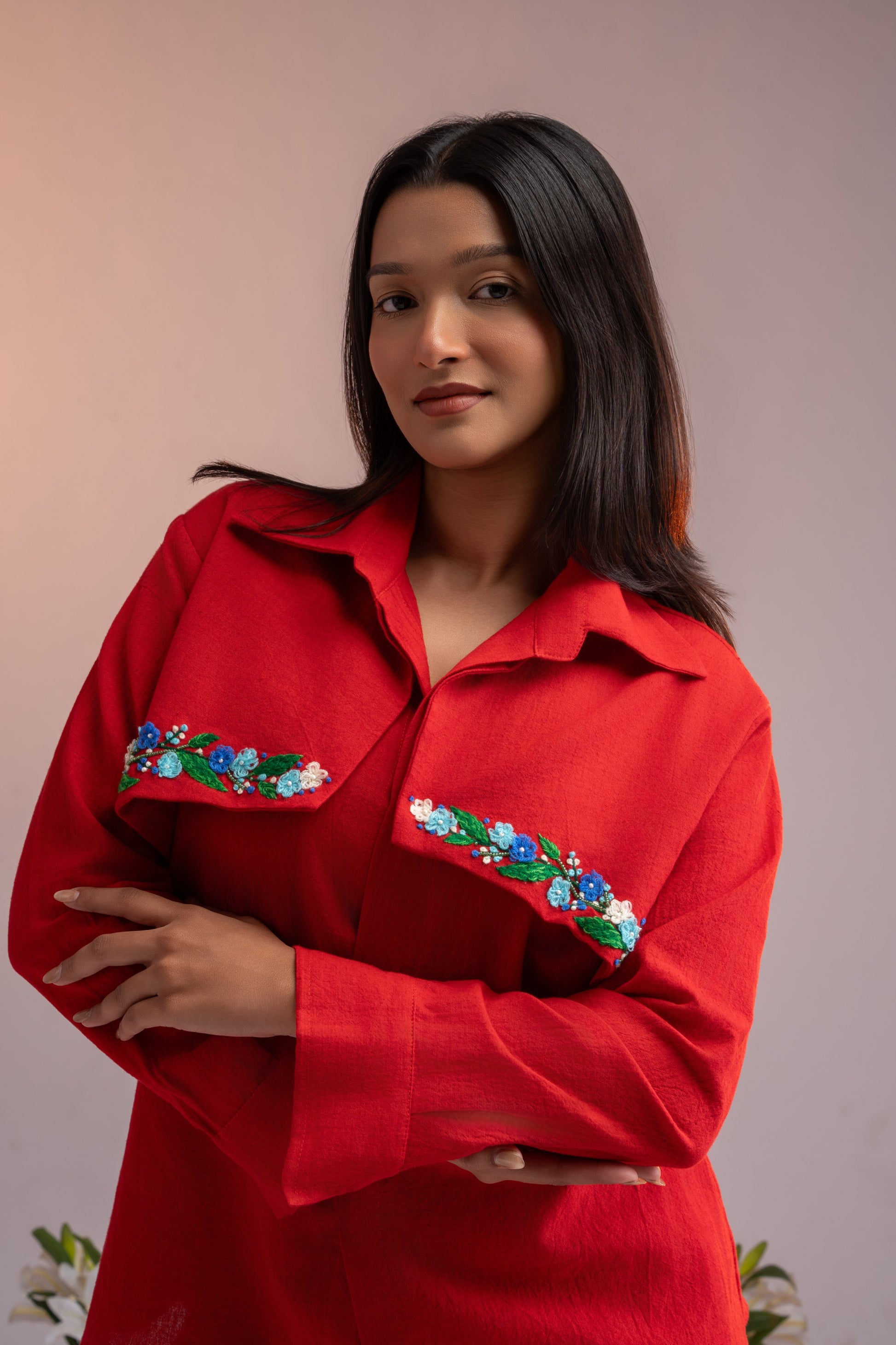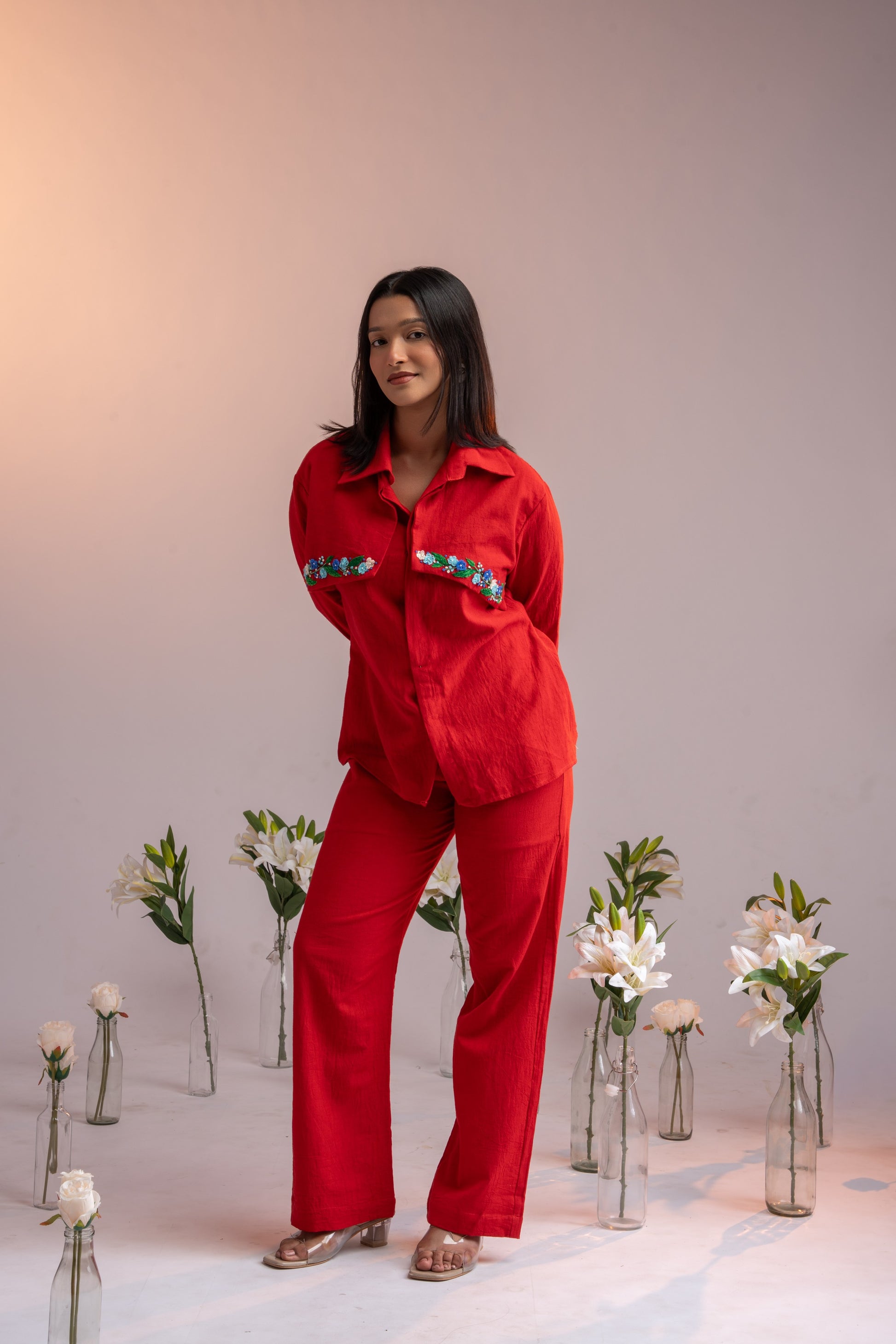 A vibrant red coord set featuring a relaxed shirt with hand-embroidered floral flaps across the front. Bold, playful, and effortlessly chic - perfect for a standout everyday look.