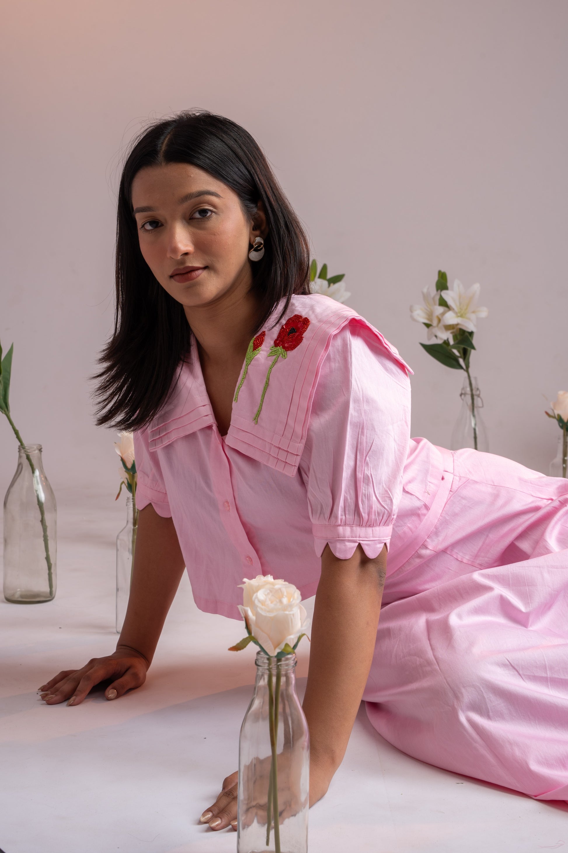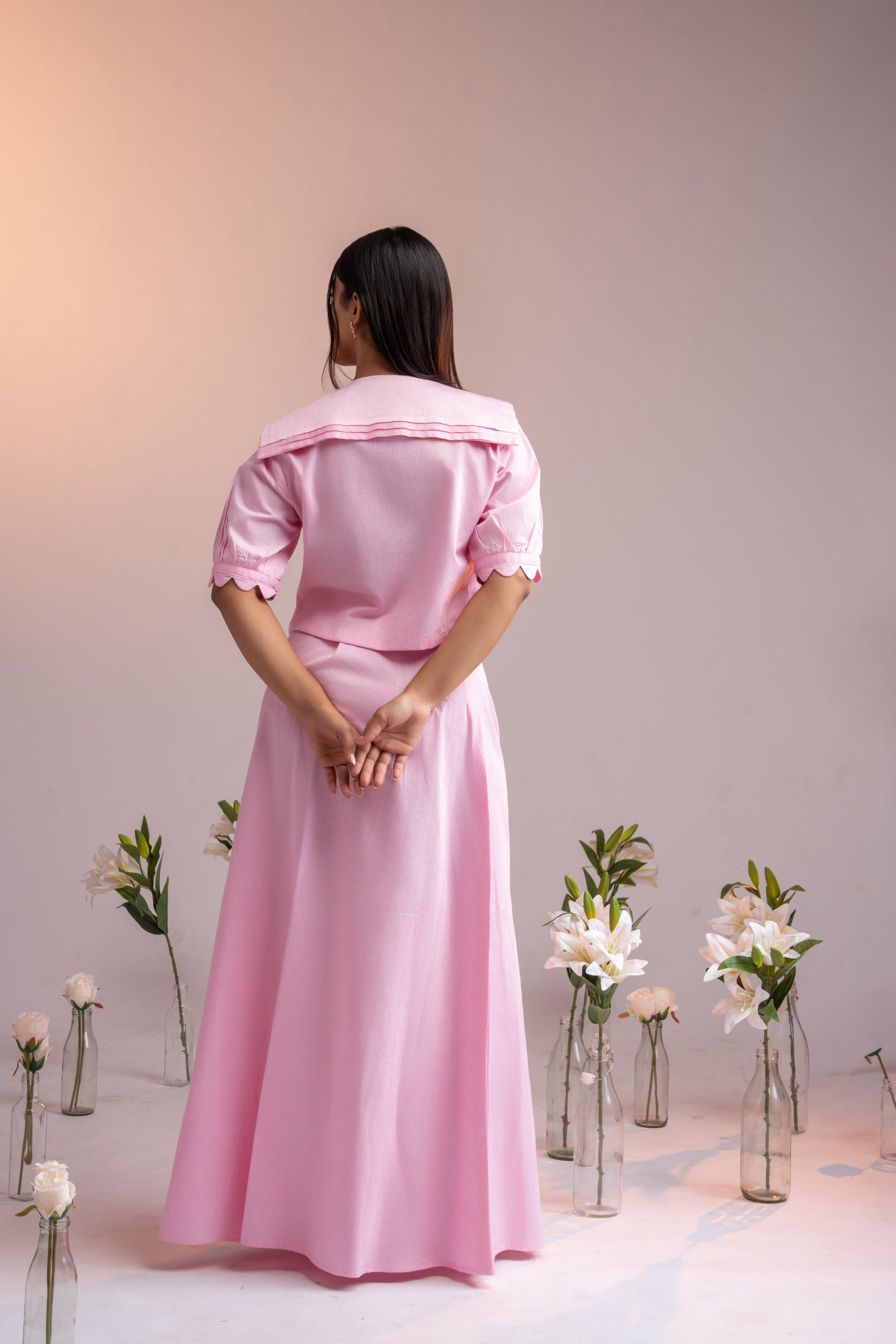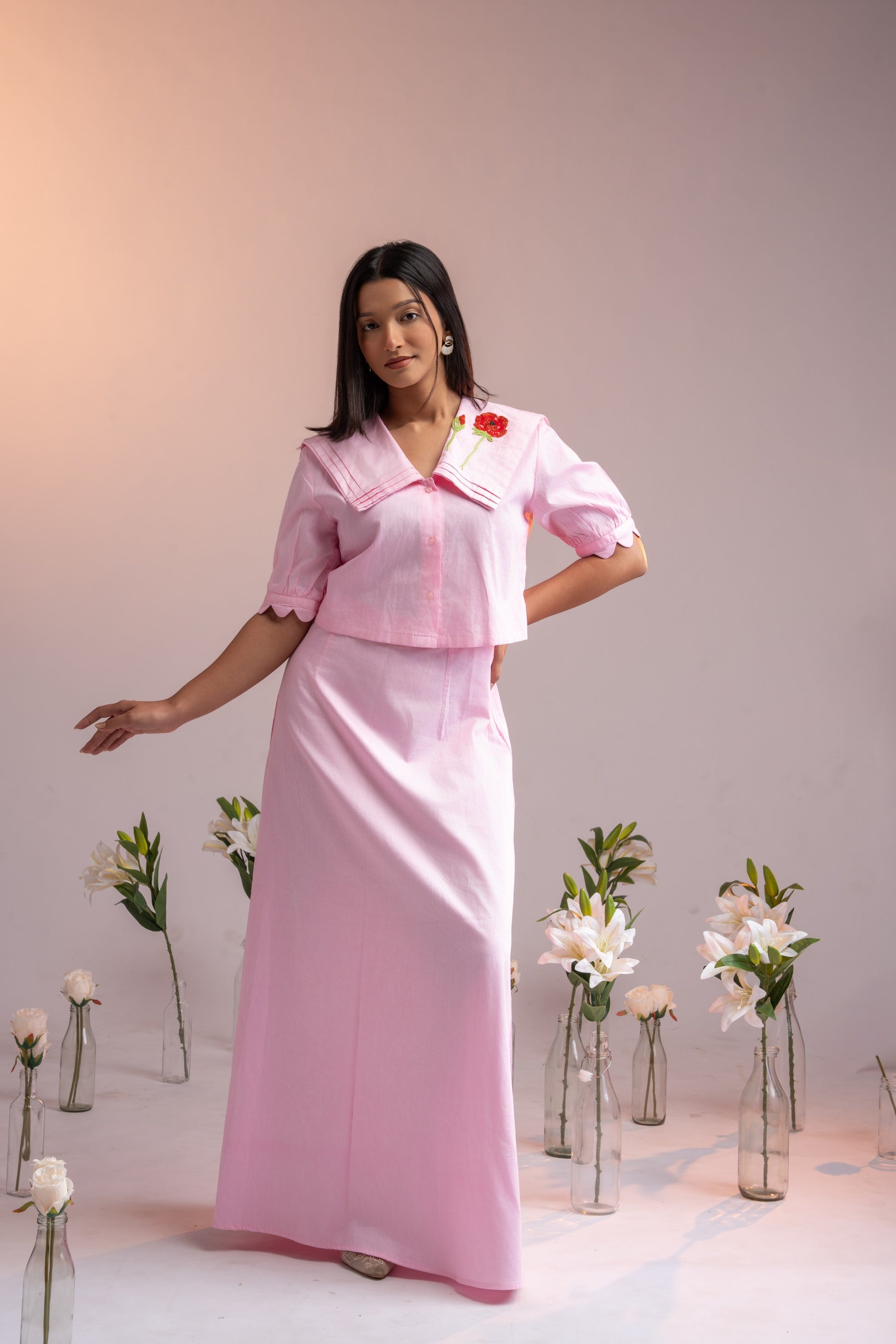 A soft pink co-ord set featuring a sailor-collar top with delicate floral embroidery, paired with a flowing maxi skirt - a sweet, feminine look perfect for everyday elegance.