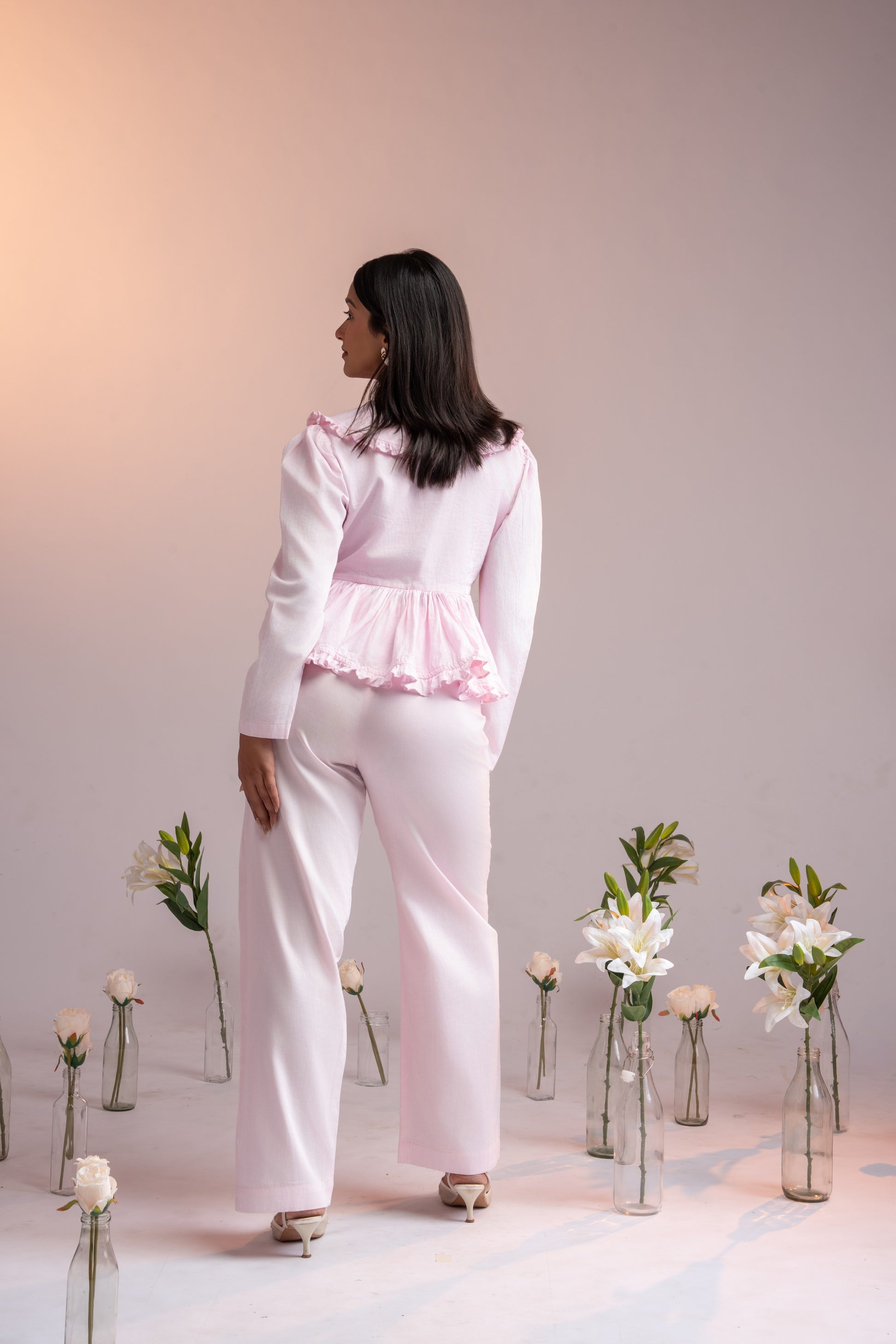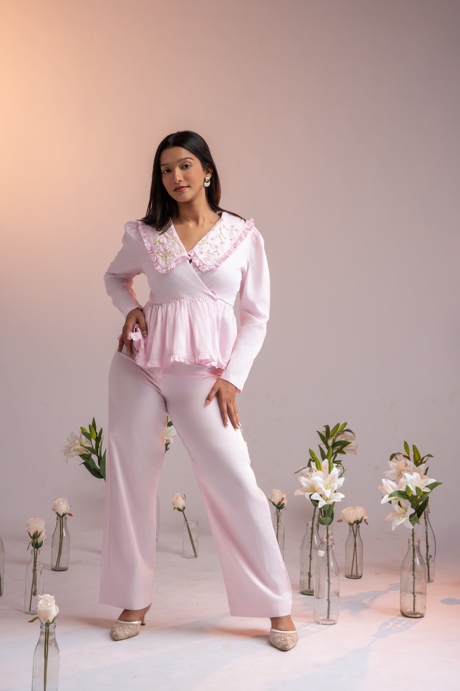 A blush-pink coord set featuring a delicate embroidered collar and a gathered peplum waist, crafted in lightweight cotton. Feminine, airy, and effortlessly graceful - perfect for a soft daytime aesthetic