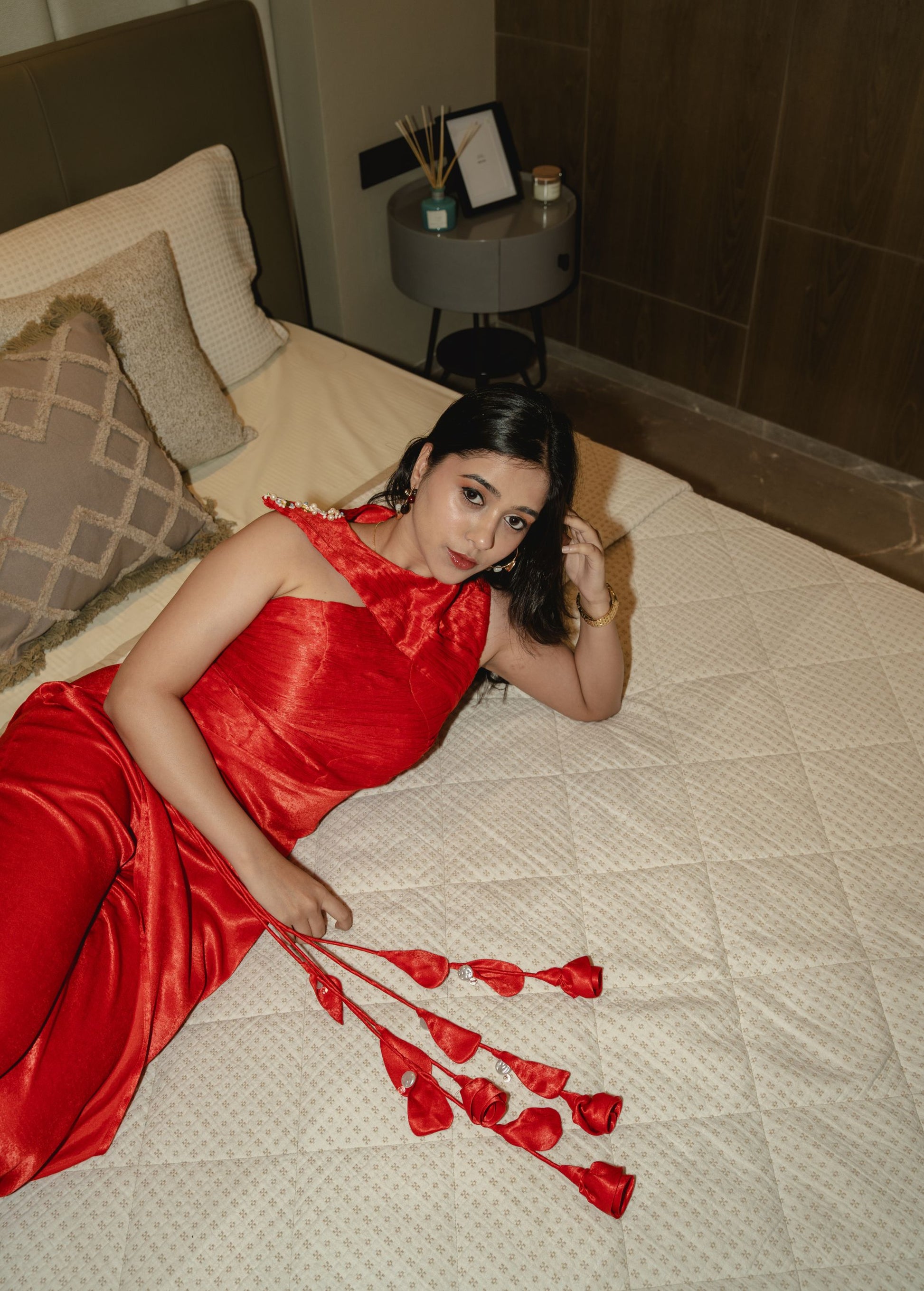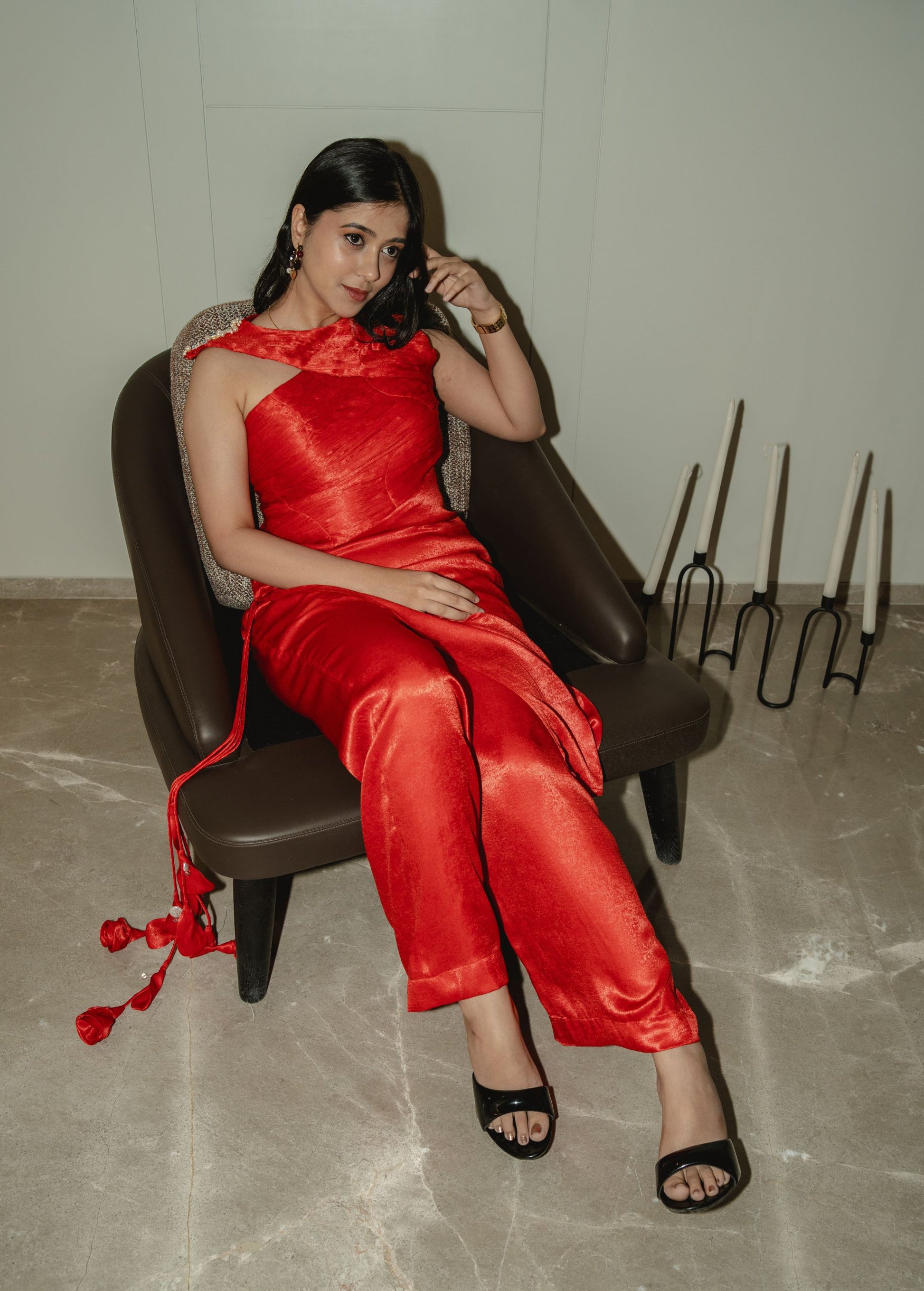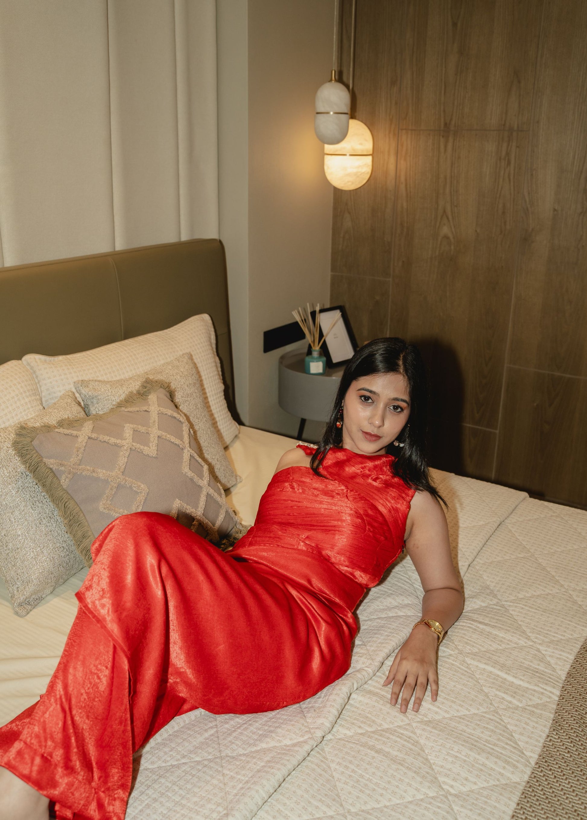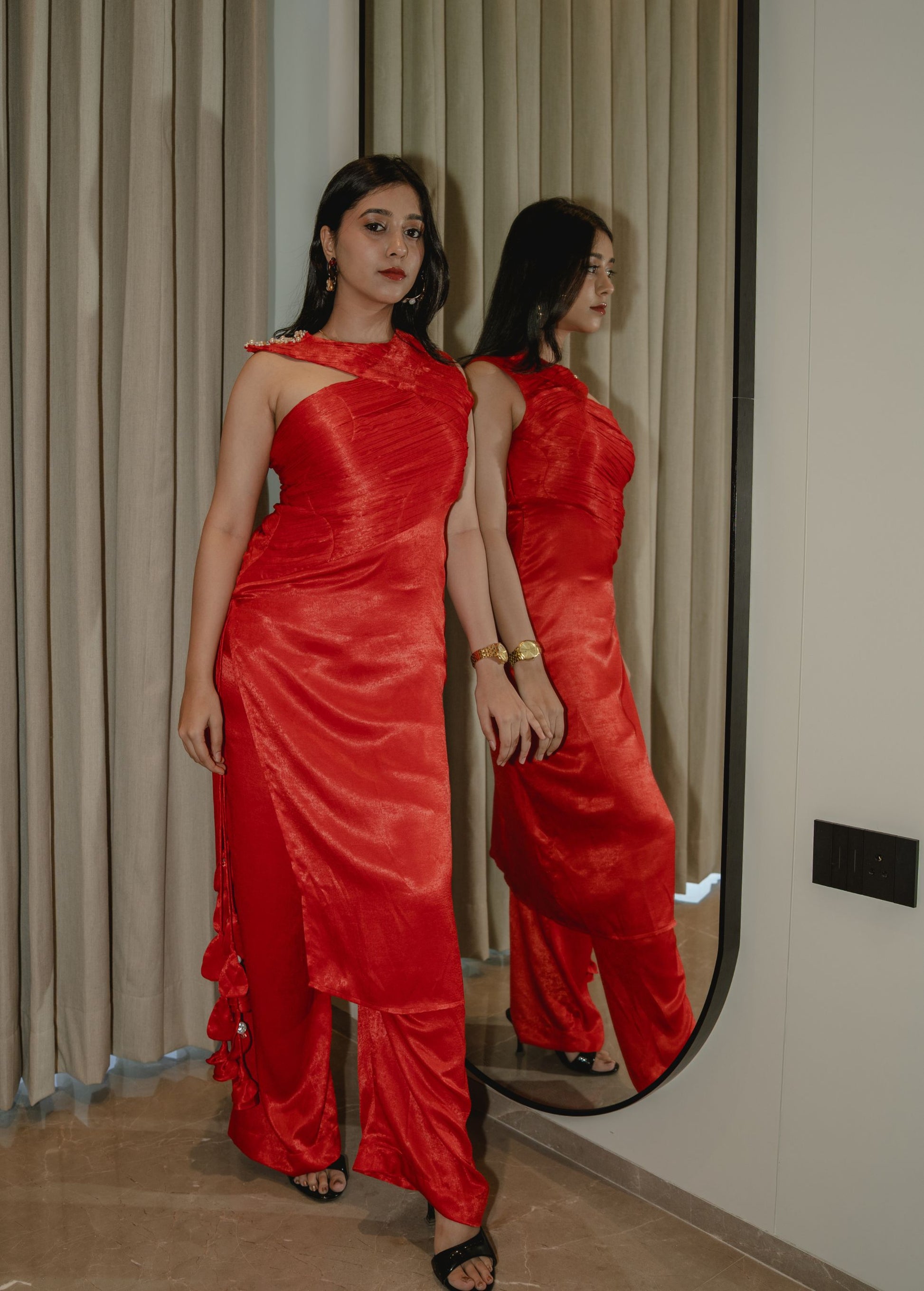 A fiery red cotton satin co-ord set with draped pleats and fabric rose hangings, perfect for glamorous nighttime parties.