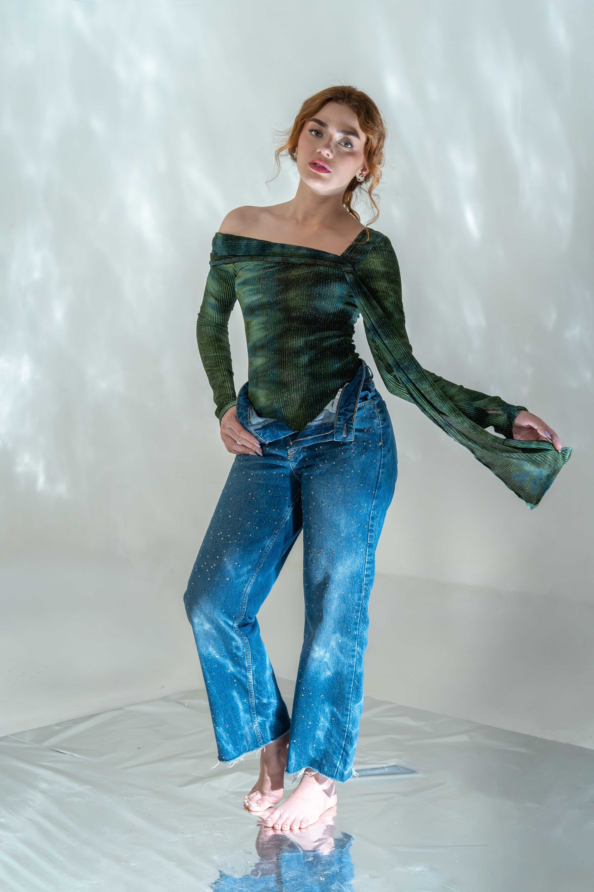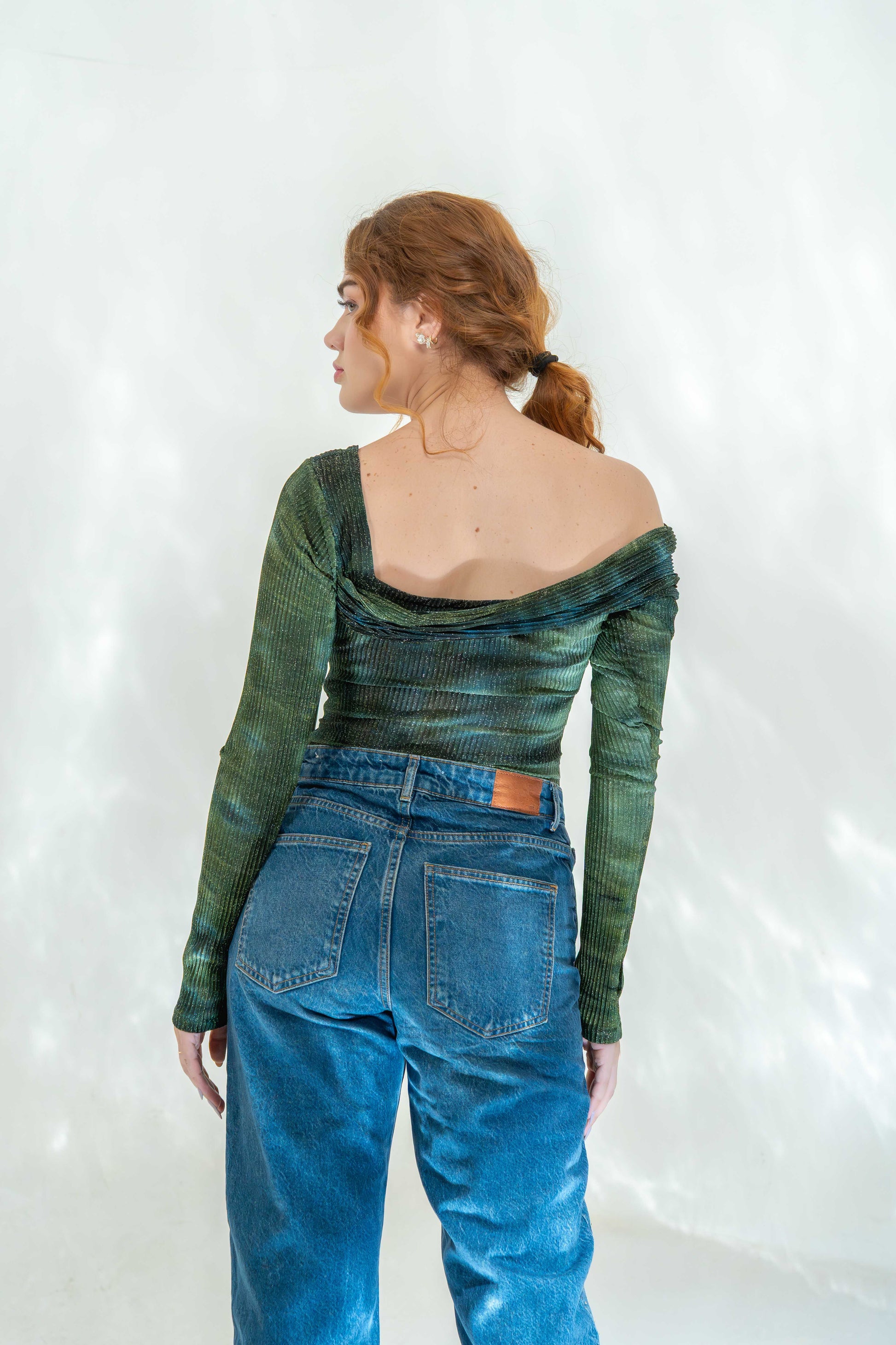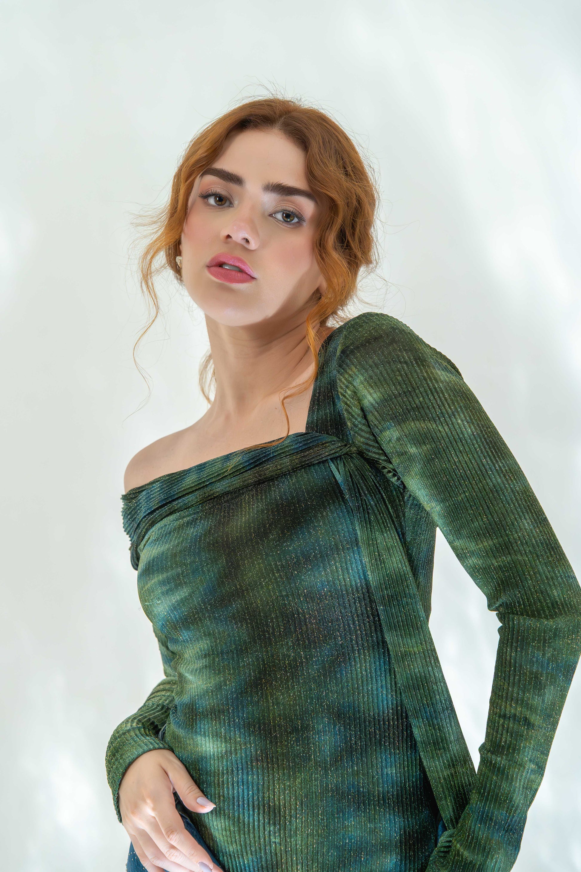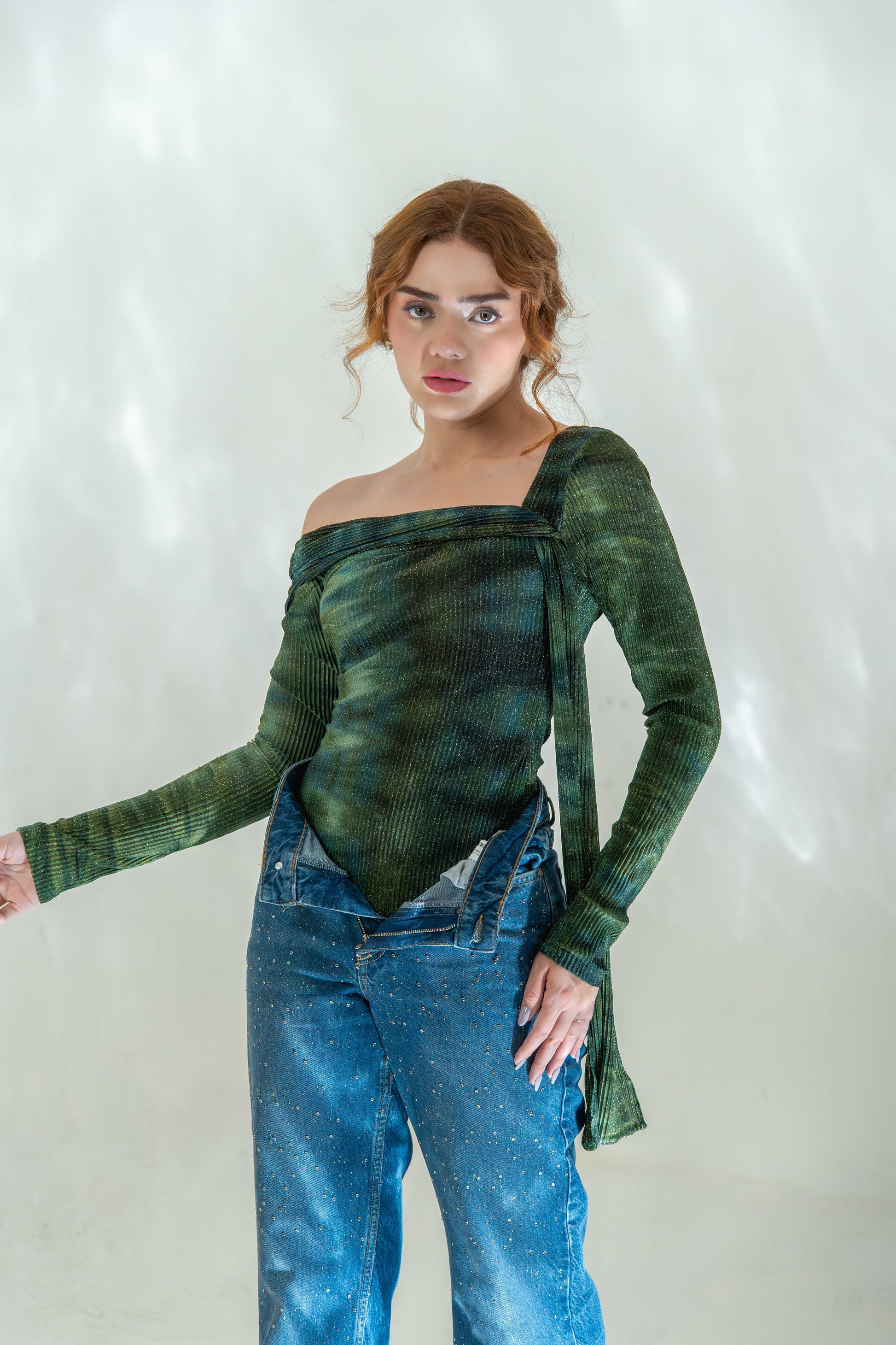 This off-shoulder bodysuit features a textured, forest-green pattern with asymmetrical sleeve detailing for an edgy twist.
