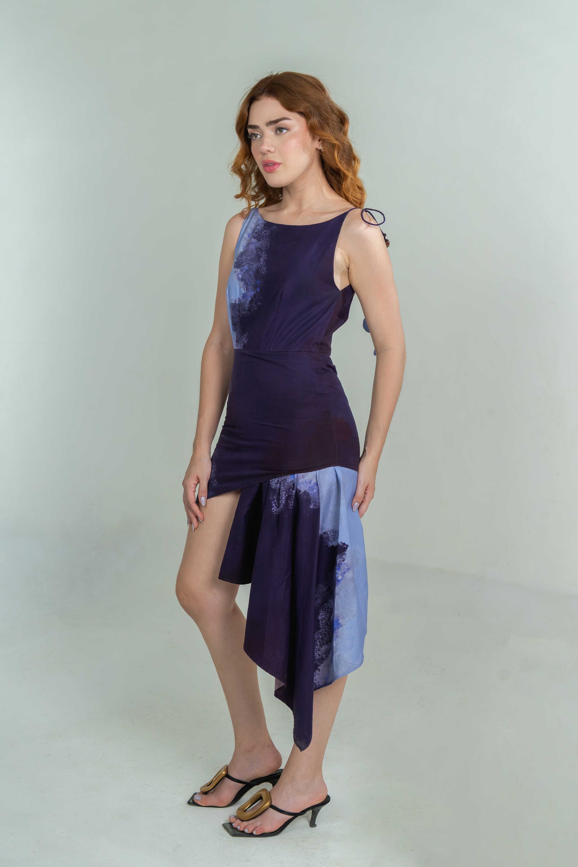 This asymmetrical dress features a sleek silhouette with a draped side panel in deep purple and blue tones. The open back is detailed with string ties, wooden beads, and playful fabric elements for a bold finish.