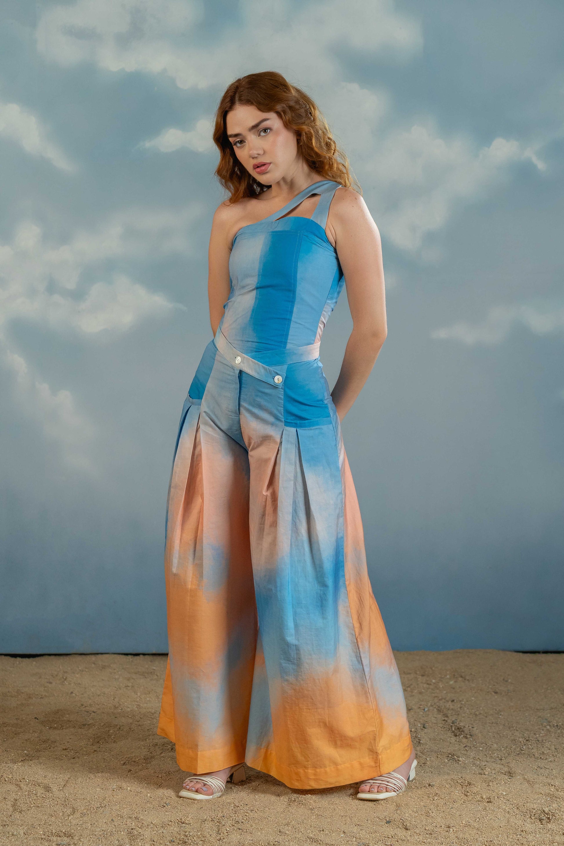 This outfit features a stylish one-shoulder corset in shades of blue paired with wide-leg, high-waisted pants in a gradient of blue and orange. The pants have front pleats, button accents, and large pockets, creating a bold yet elegant look.